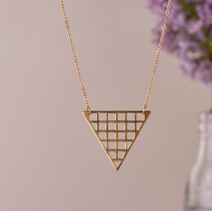 This cut-out triangle pendant is super lightweight and made from raw brass, giving it a slightly matte finish.