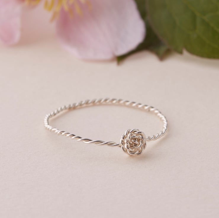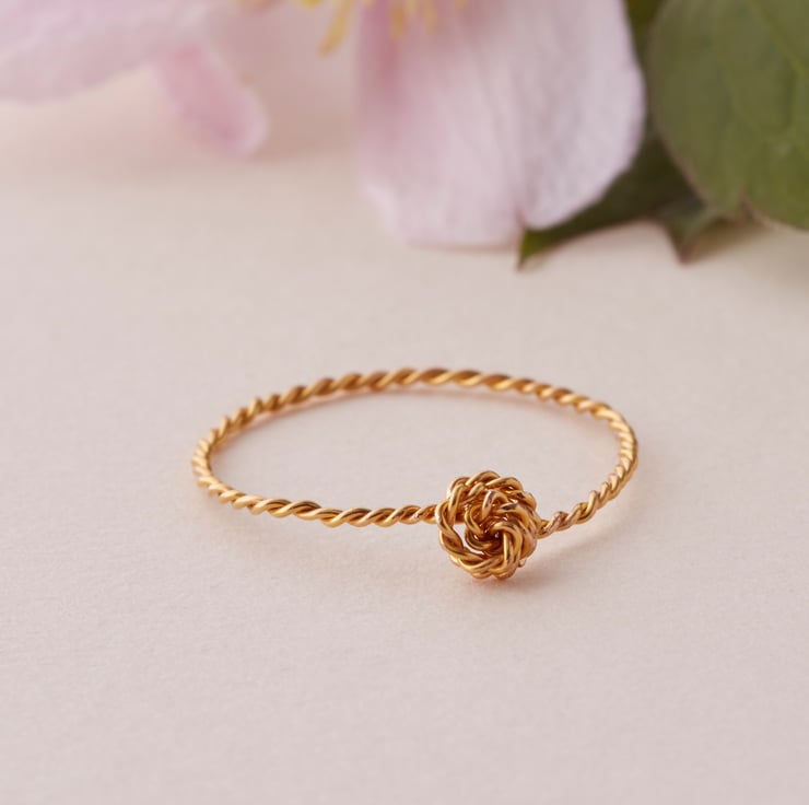 Fine wire is twisted and wrapped by hand to form a delicate, detailed skinny ring band with a rope effect, finishing in a knot at the front.