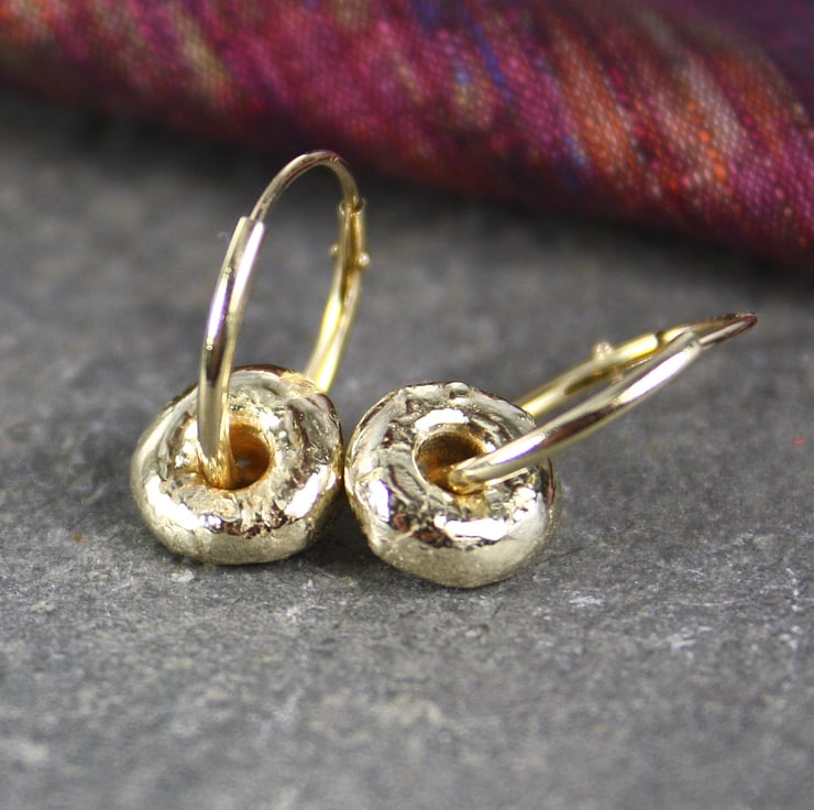 Small handmade melted 9ct yellow gold nuggets on hoops.