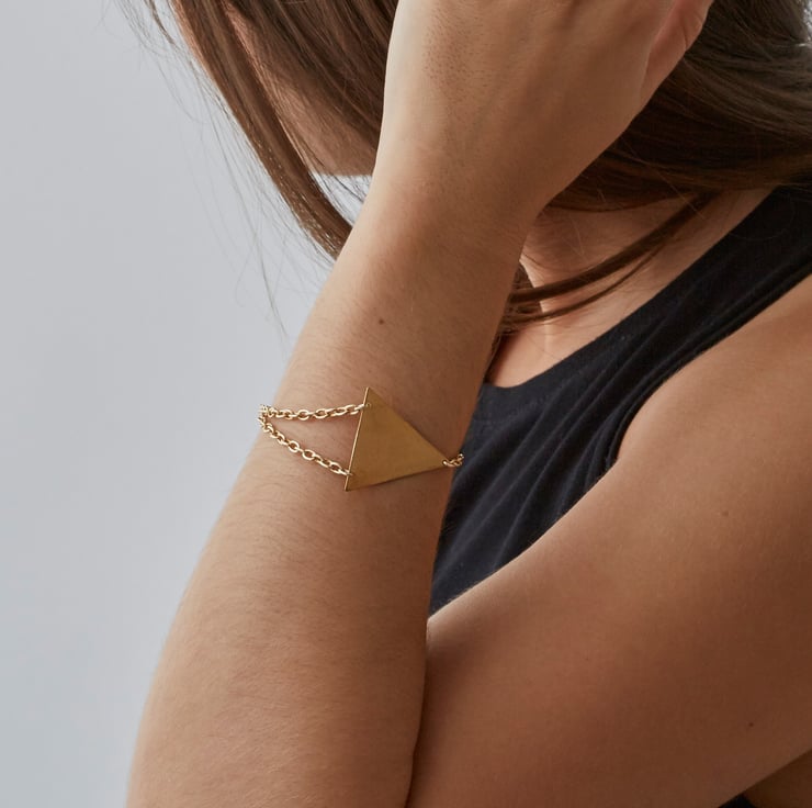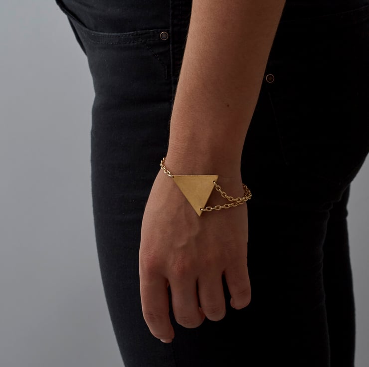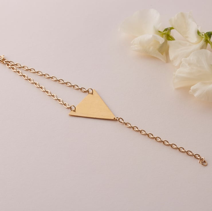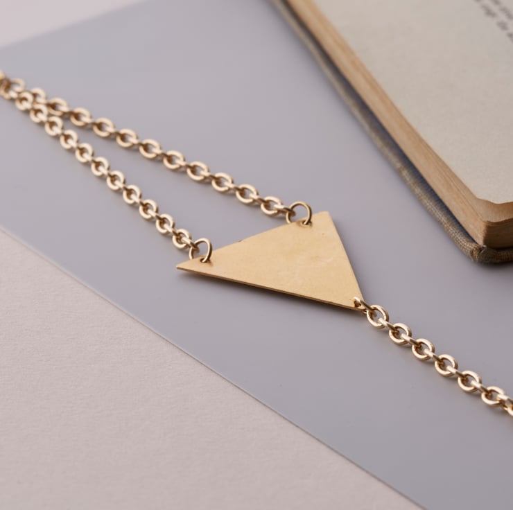Brass triangle and gold plated chain that is nickel-safe adhering to EU regulations.