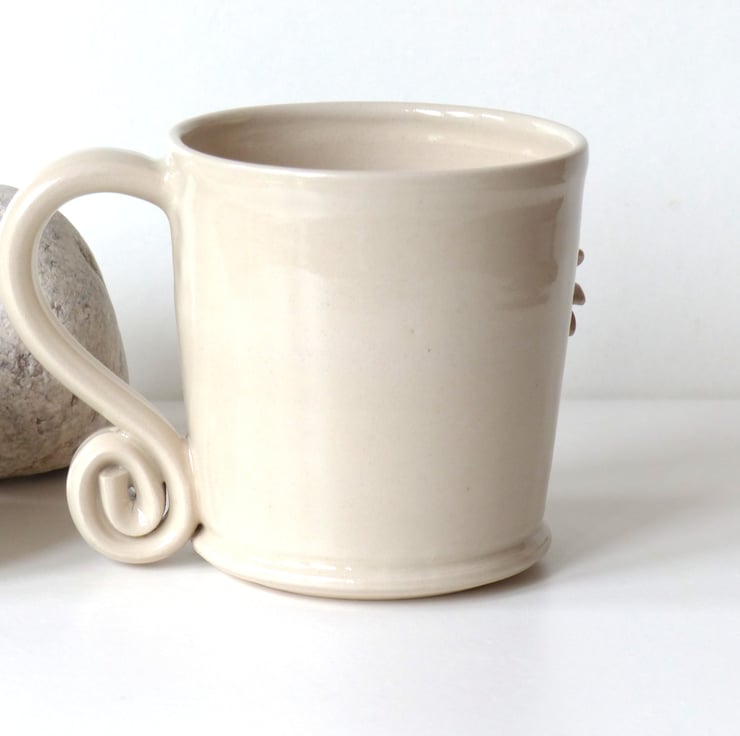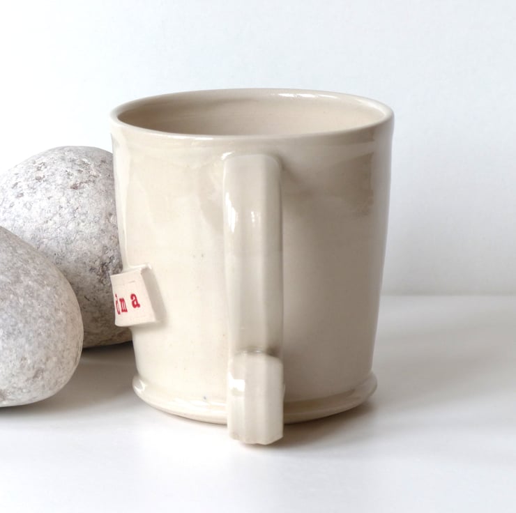 I threw this mug on the potter's wheel using a white stoneware clay. I then turned the base and added the handle and decoration before bisque firing the mug. I glazed it using a lovely transparent glaze and again fired it, this time to 1240C stoneware making it strong and durable.