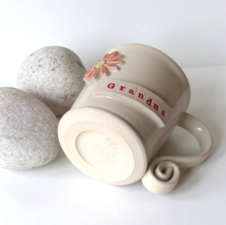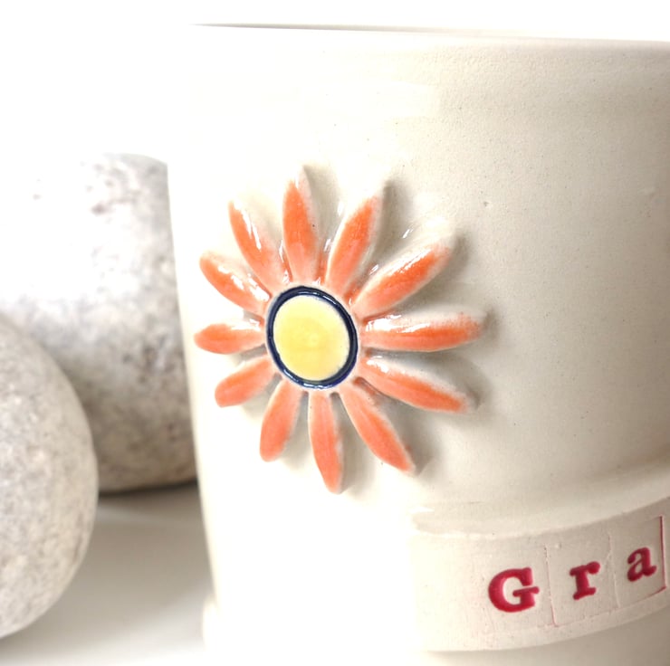 This mug has the words 'Grandma' stamped into raised clay on the side of the mug with a lovely big cheery orange and yellow flower.