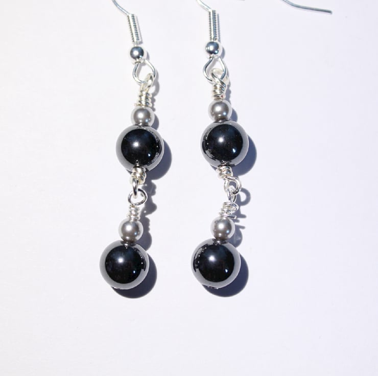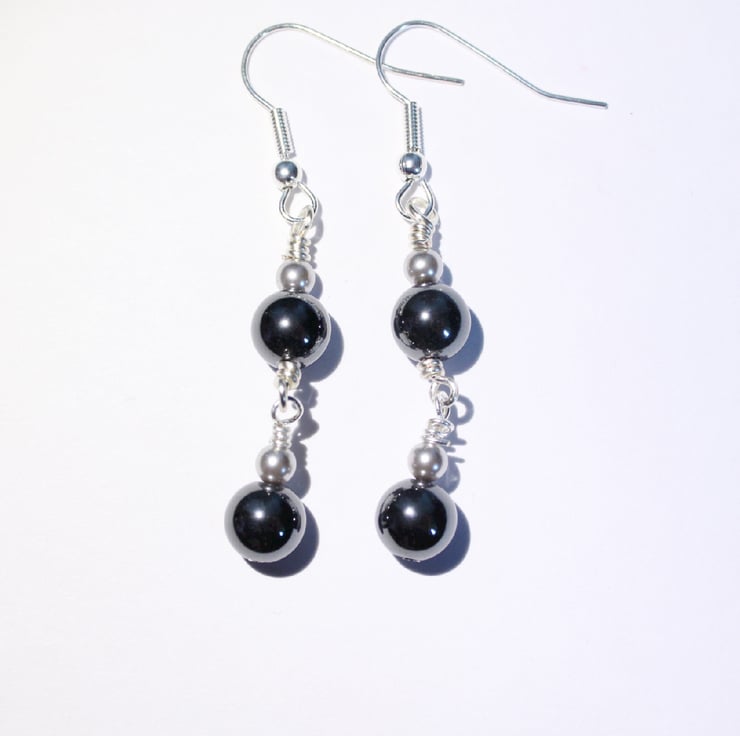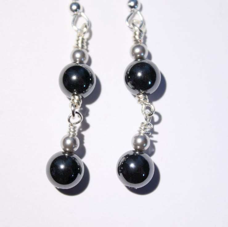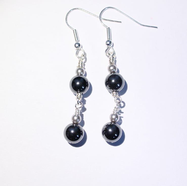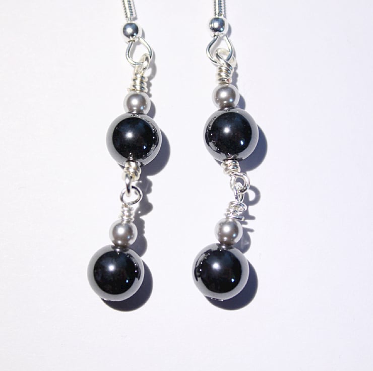 There are two identical parts to each earring. Each consists of one polished 8 mm hematite ball and one 4 mm silver plated ball. Both pieces have been made from silver plated non-tarnish wire, wrapped to created a secure linkage.