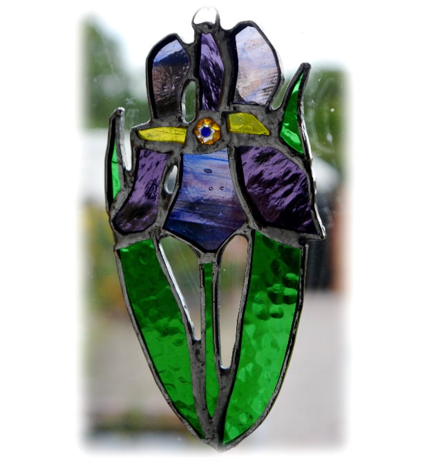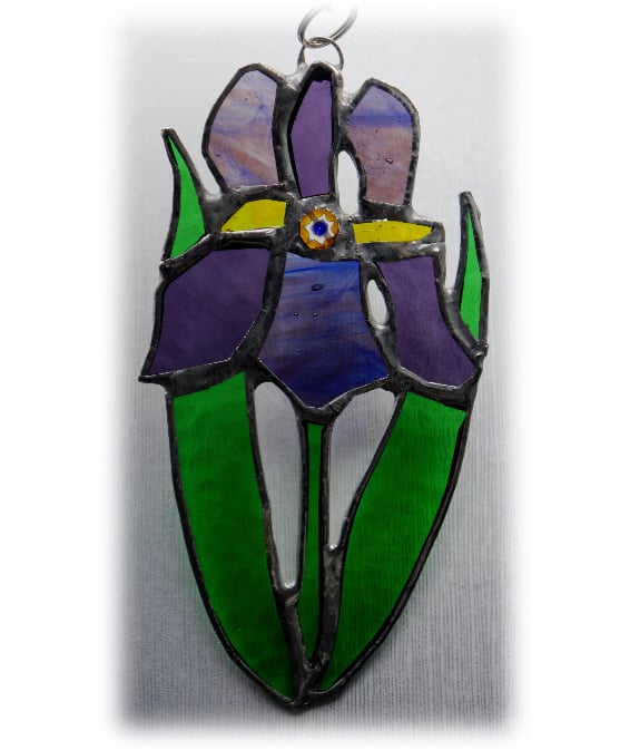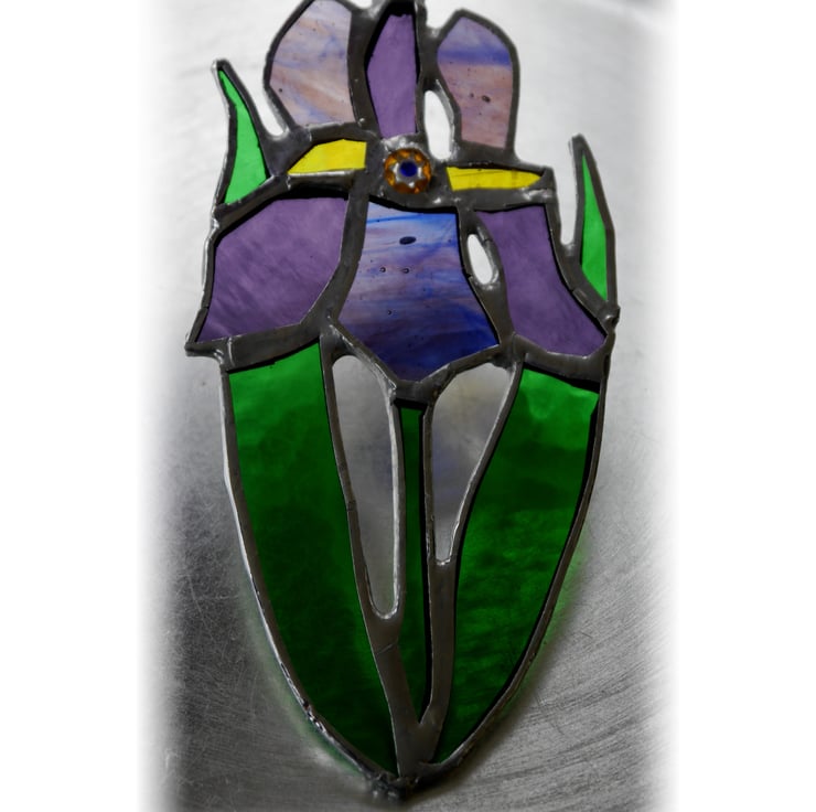 It is a simple floral design, of a beautiful purple flower, an iris. I've used streaky and textured glass to make it extra pretty. Its strappy leaves are bright green and it has a pretty floral bead at the centre of the flower enhanced with some pieces of golden yellow glass.