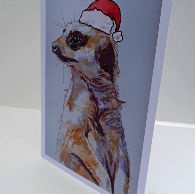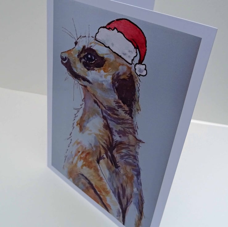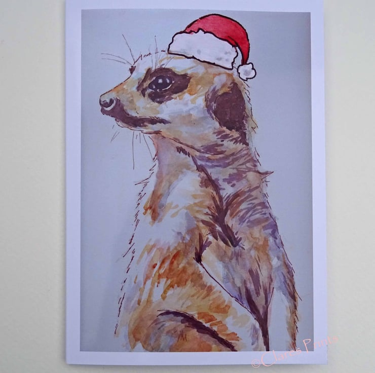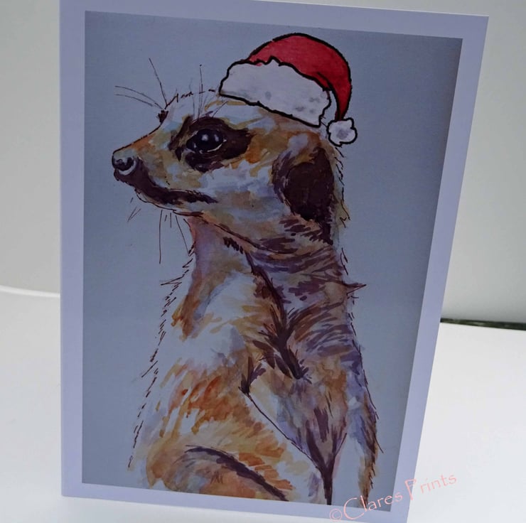 Blank greeting card from my original watercolour & ink painting Christmas Meerkat.