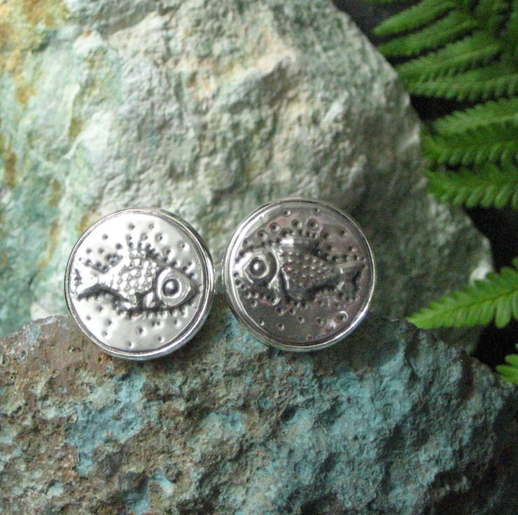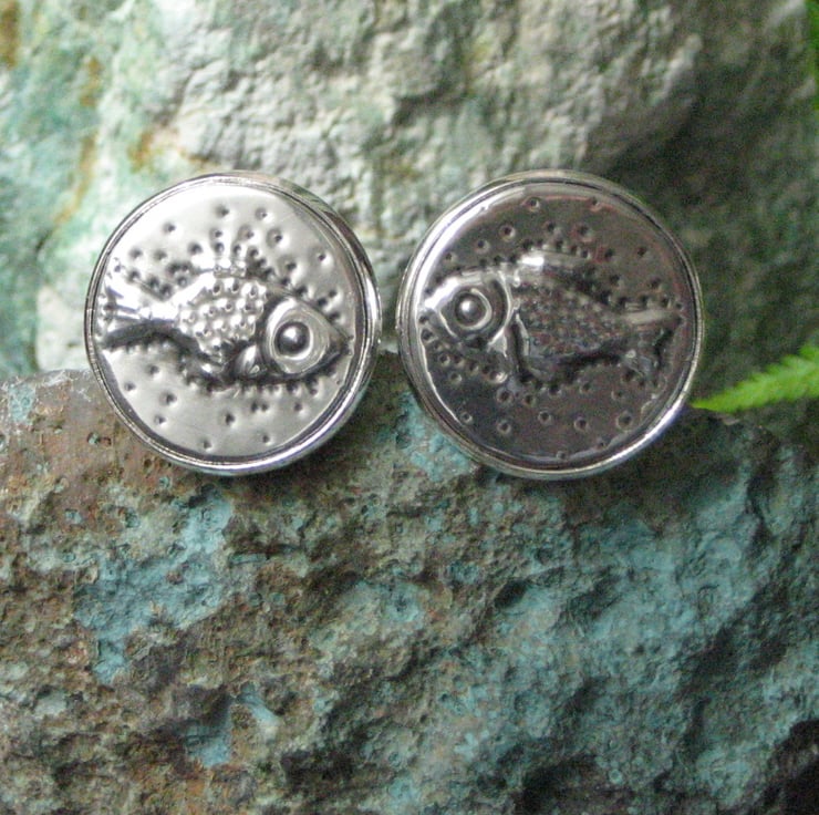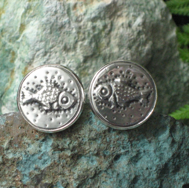 Fish cuff links handmade in pewter using the repousse method. Each link measures 21mm across and has been hand-crafted in lead-free pewter. Provided with a smart grey gift box. A perfect present for a man who loves angling, aquatics or the sea for a 10th Wedding Anniversary or Birthday.