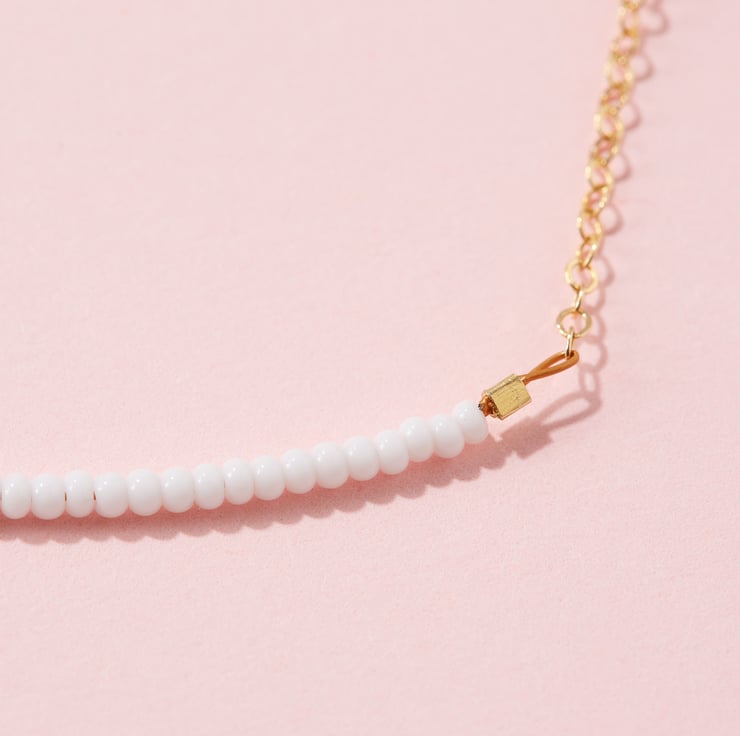 This minimalist necklace frames the collarbone with a row of miniscule glass beads, threaded onto gold wire and fixed to fine cable chain.