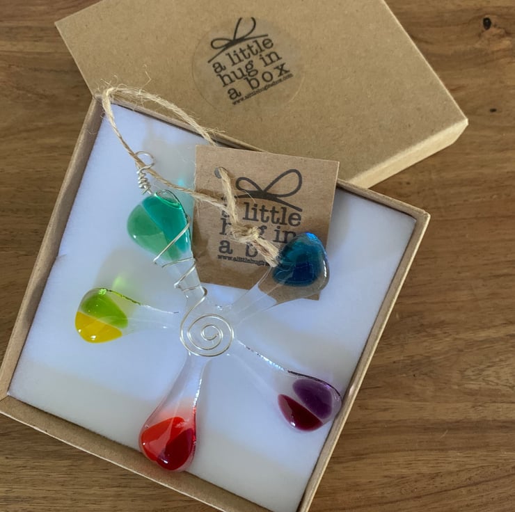 A new addition to the "A little hug in a box range" this beautiful handmade fused glass flower has 5 petals each featuring two rainbow colours and wrapped with silver plated wire for ease of hanging. The rainbow transparent glass catches the light and is a beautiful addition to a window either inside or outside of your home.