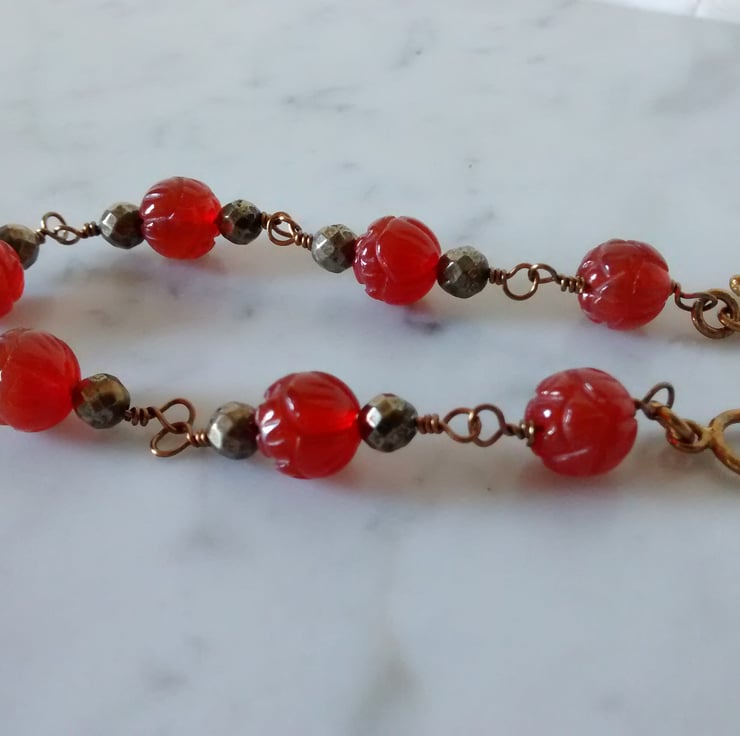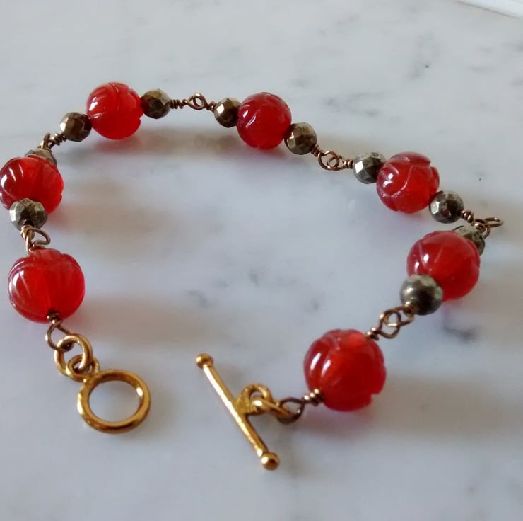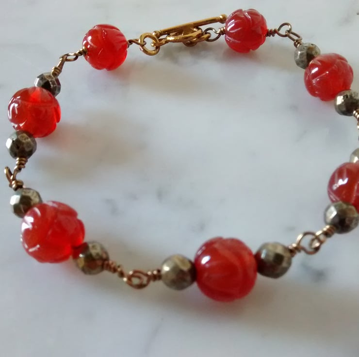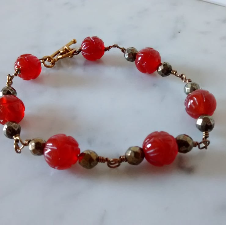 BRACELET WITH CARVED LOTUS FLOWERS AND GOLD FACETED PYRITE BEADS. CLOSES WITH A ANTIQUE BRONZE TOGGLE. ALL HELD TOGETHER WITH ROSARY WIRE WORK.