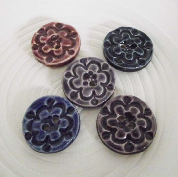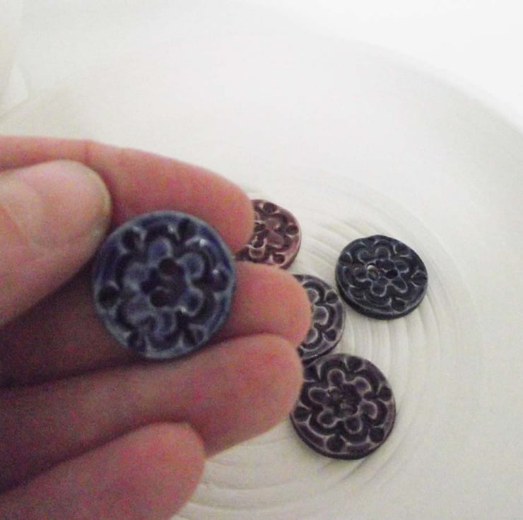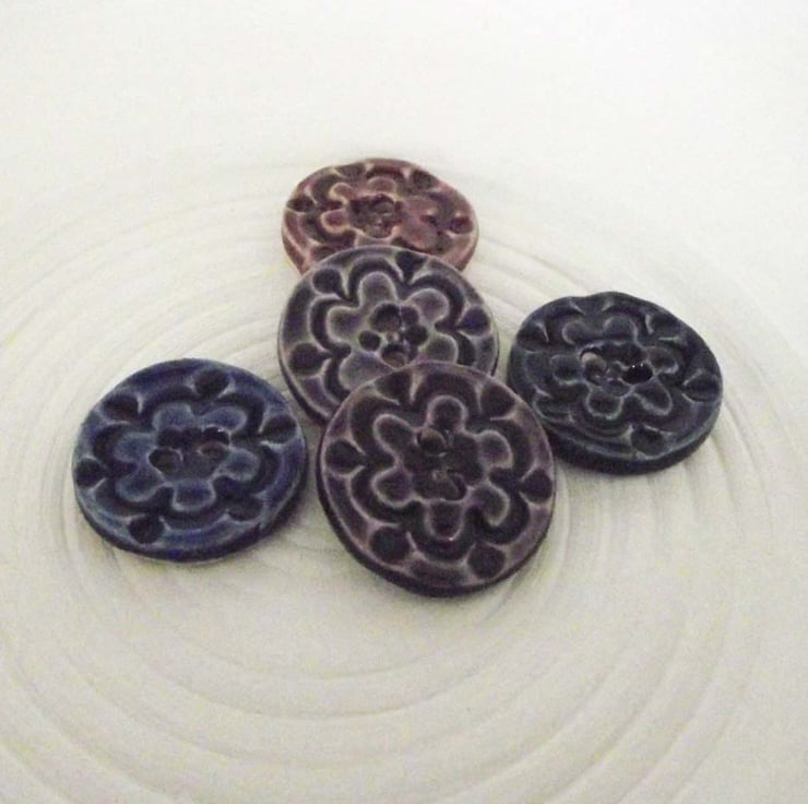 Set of five little handmade ceramic buttons in purples and blues