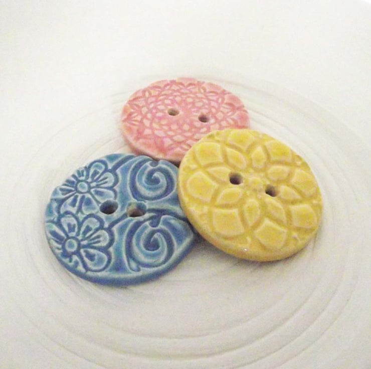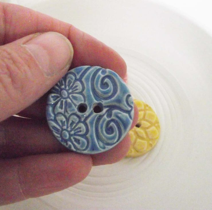 This set of three buttons are made from white earthenware clay, embossed and glazed to 1100 degrees, so nice and strong.