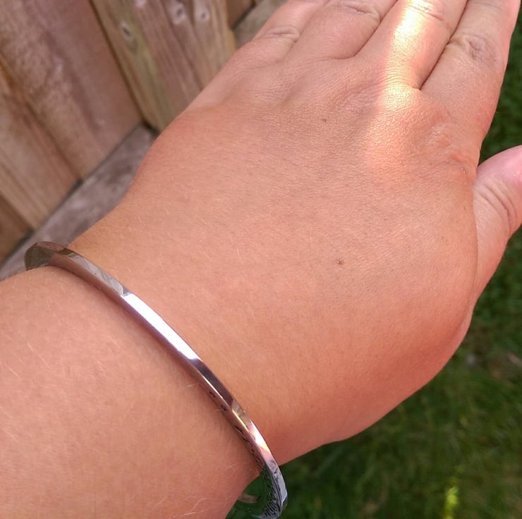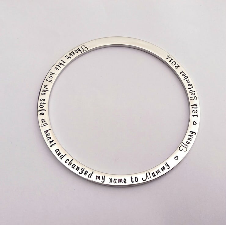 This is a lovely personalised bangle which is 2mm thick. The inside opening measures 65mm. It is stamped on the inside edge, the last photo shows how it is worn.