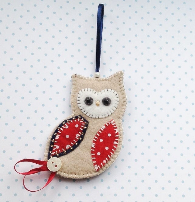 It features an owl with appliqué wing and tummy in red polka dot fabric, complete with stitched face with beaded eyes, gold seed bead detailing around the wing and a pretty ribbon and button tail. This is a lovely felt hanging Owl decoration perfect for your Christmas tree! The owl is complete with a navy blue ribbon hanging loop.