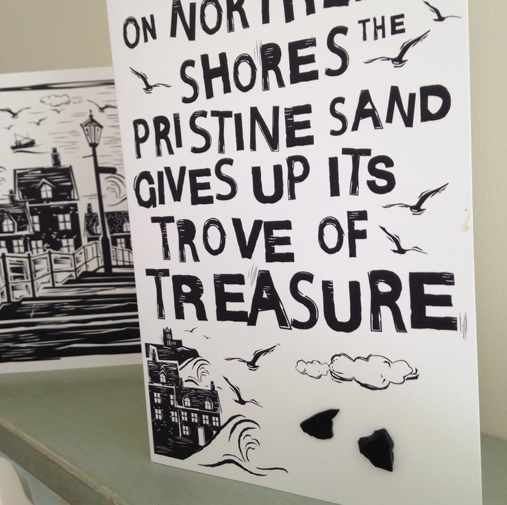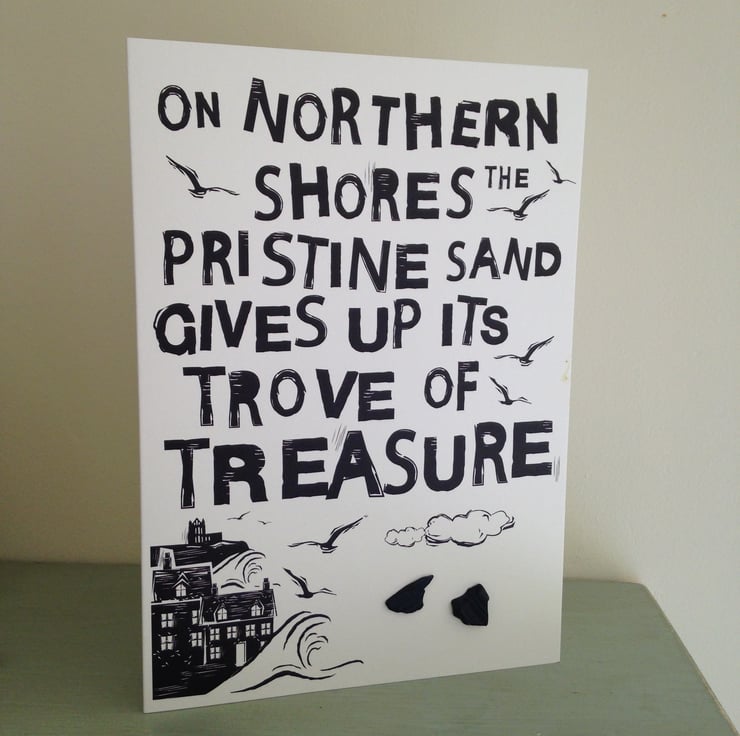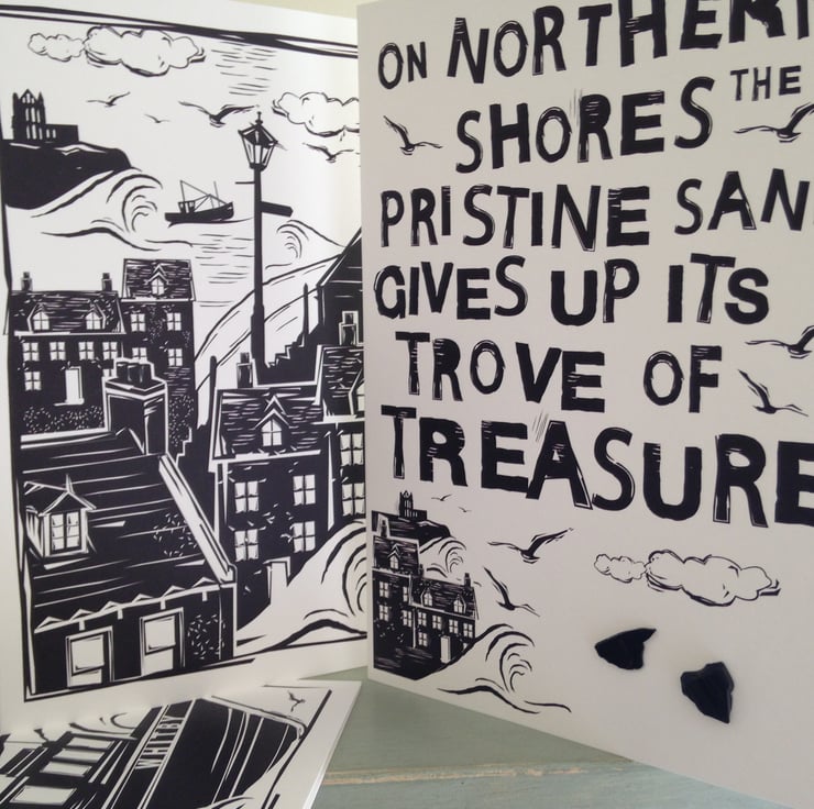 This printed card, taken from my original illustration is of Whitby Abbey, and features a passage from a poem written about the Whitby coast, and the sea washed jet found on it's beaches. The card has 2 pieces of sea washed jet attached, which has been collected by us on the beaches surrounding the coast.