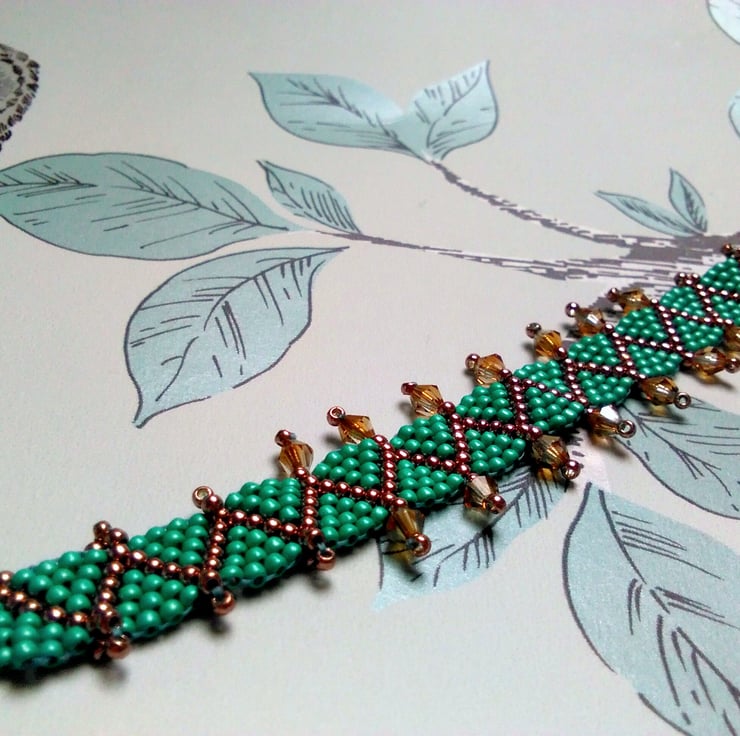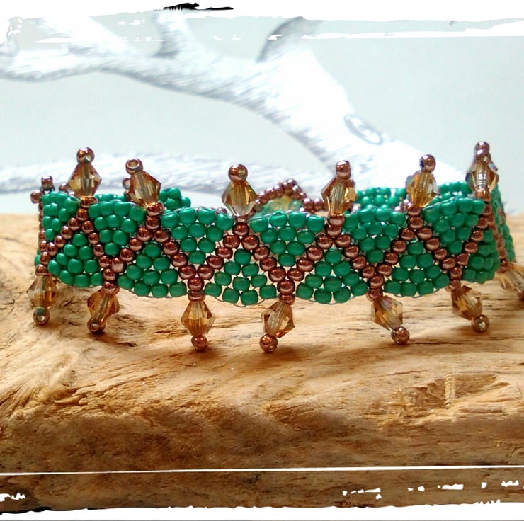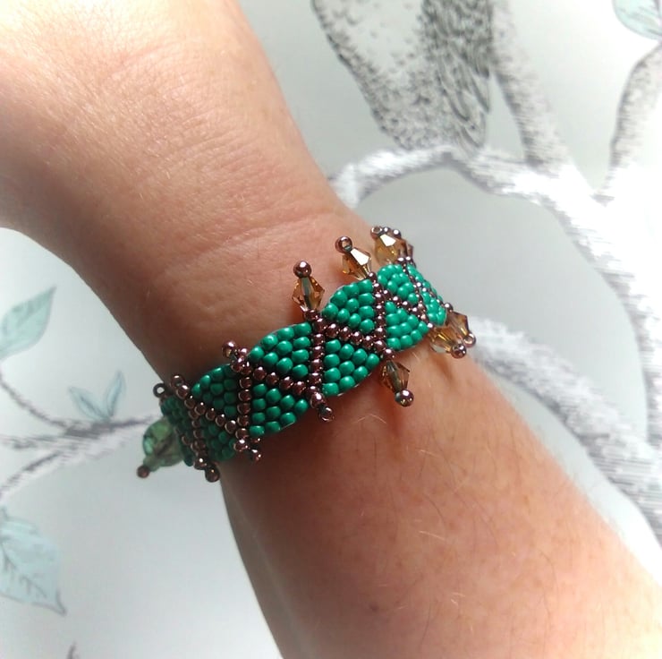 Each point across the middle section has been decorated with high quality Czech crystal bicones from Preciosa. The seed beads themselves are hard to find but excellent quality, metallic permanent finish coated seed beads made in Japan. The bright copper or rose gold metallic coating is high shine and then there's the contrasting matte metallic turquoise, teal or light jade colour - only found in one bead shop in the UK, so a very unique beaded bracelet altogether. I have added and weaved each bead on by hand, so this piece took some hours of solid beading to complete! The total length of the bracelet is 18.5cm, however it is adjustable down to 16.5cm. This bracelet would fit small to medium sized wrists, but I can easily add more loops to the end to suit your wrist, no extra charge. It sparkles when it catches the light and is a lovely lightweight bracelet with no metal components, good for people with metal allergies, as it uses a glass bead with loop closure!