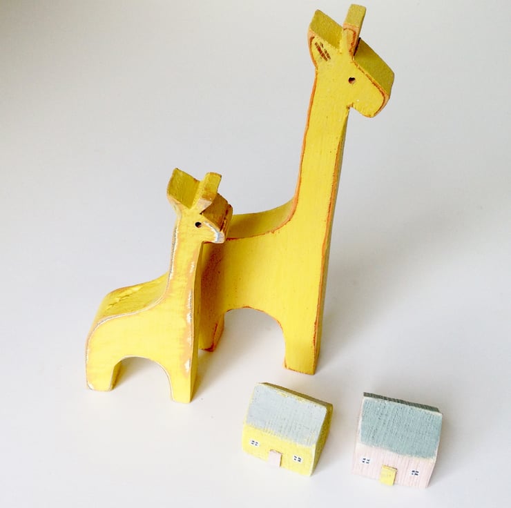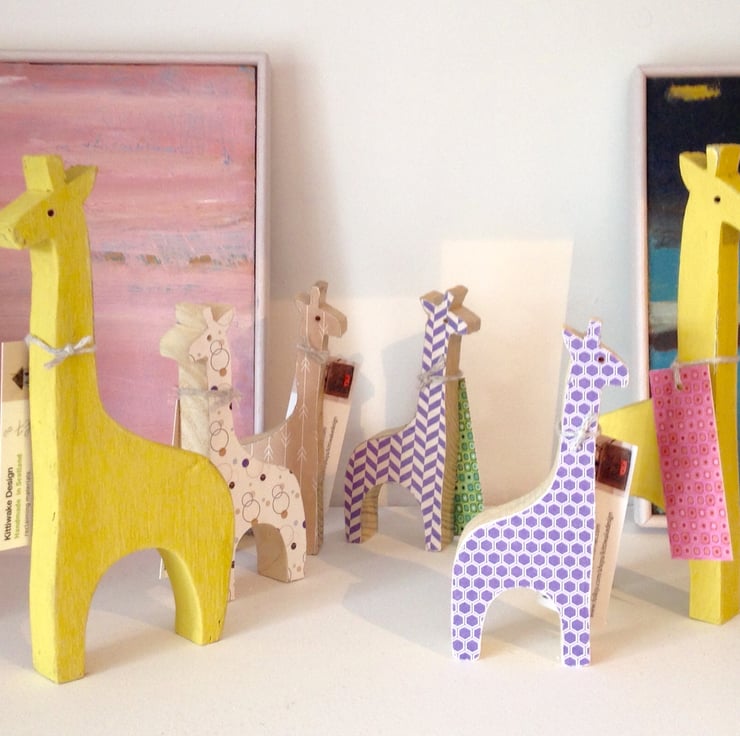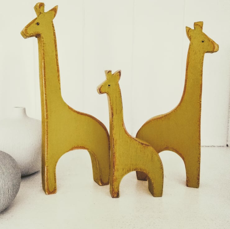 A lovely bright elegant giraffe made using reclaimed wood, painted in Annie Sloan Chalk Paints and sanded, distressed and matt varnish applied. This look great in a children's room as an ornament or also in the main room if Giraffes are your animal of choice. They look great grouped together with the baby ones.