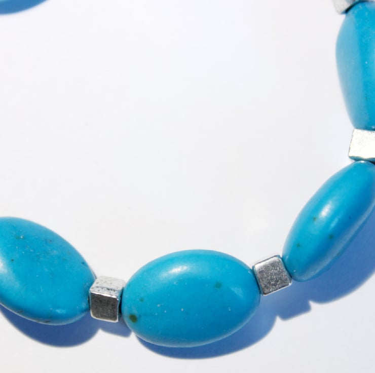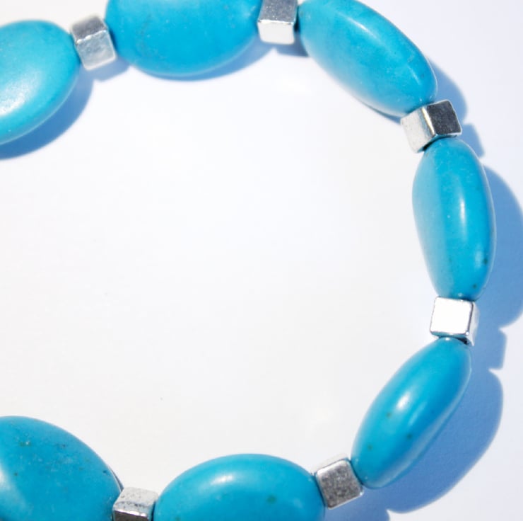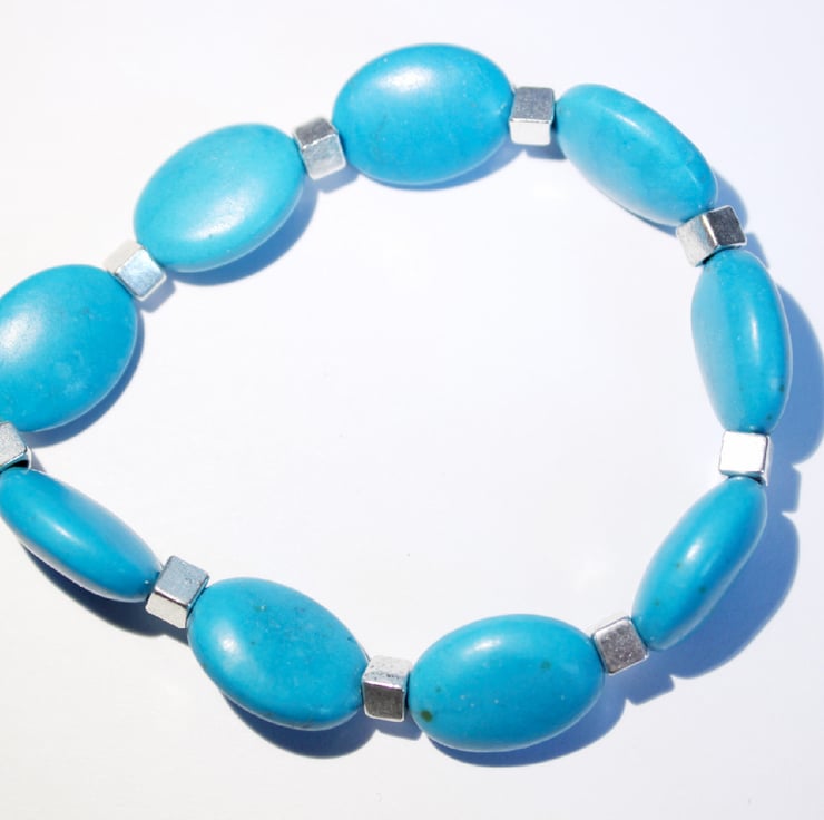 Beautiful oval beads of turquoise dyed howlite are separated with silver coloured cubes to make a pretty stacking bracelet.