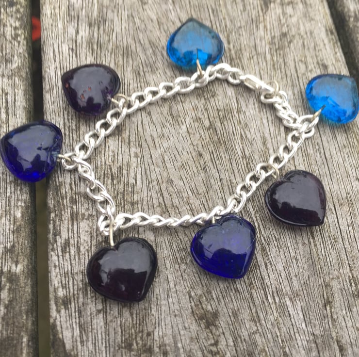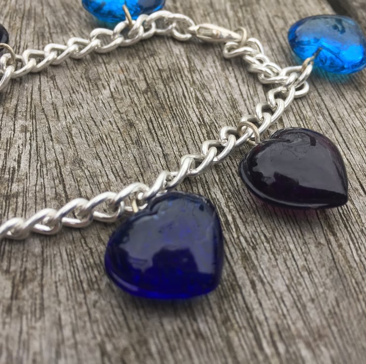Sky and dark blue, and purple glass hearts bracelet on silver plated chain.