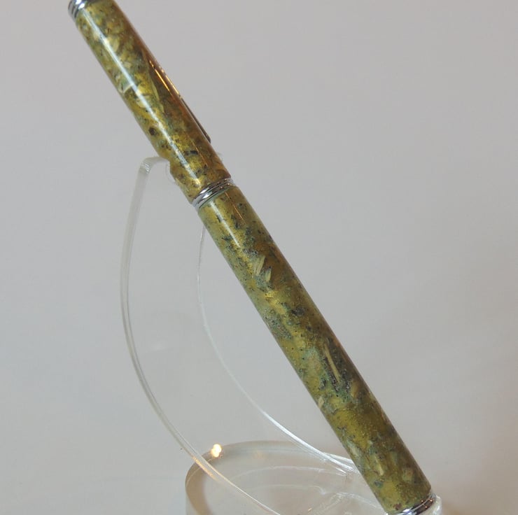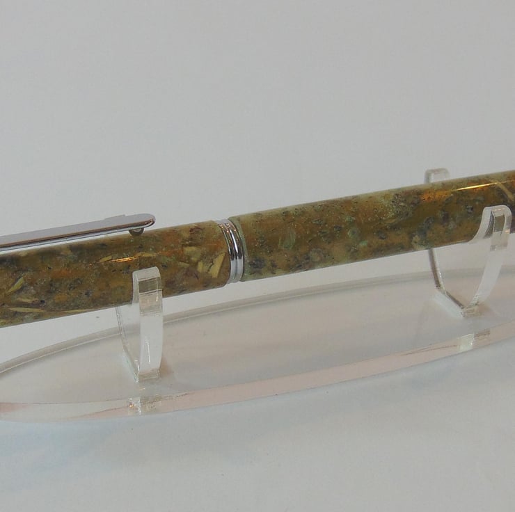 In the 19th century Absinthe was a strong alcoholic drink, favored by writers and artists. This drink contains wormwood, and whilst producing other custom pen blanks with different botanicals I wondered what a pen blank containing wormwood would look like. This is the outcome.