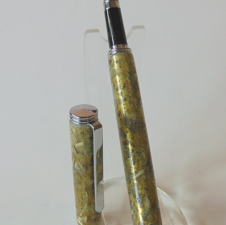 This fountain pen was manufactured using my own hand cast pen blank which incorporates wormwood in UV stable resin. The resin is then trimmed and turned, sanded and polished on a lathe prior to fitting the pen mechanisms. Due to the blanks not being mass produced, each blank and therefore each pen is unique.