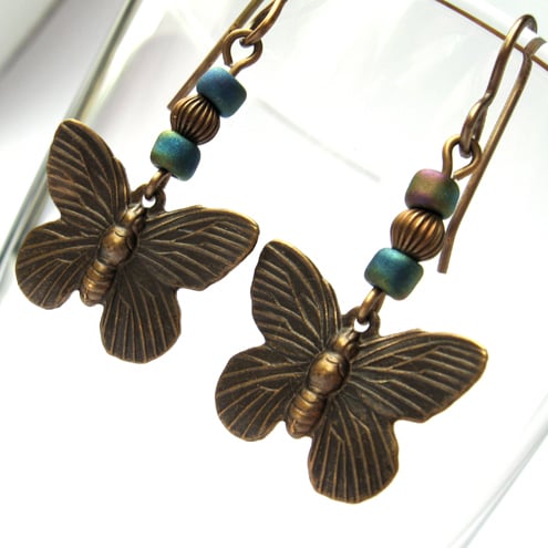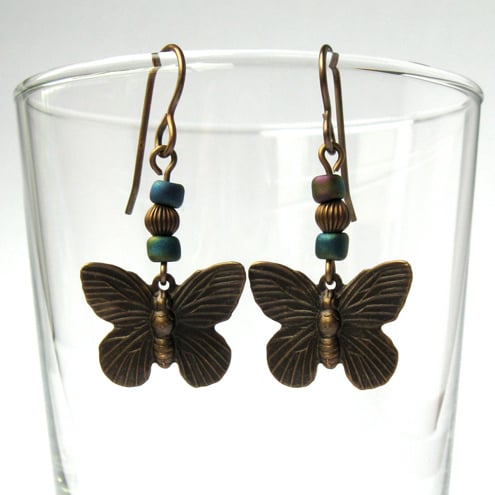 Handmade earrings with beautiful little pure brass butterflies, and opaque Aurora Borealis glass peacock beads.