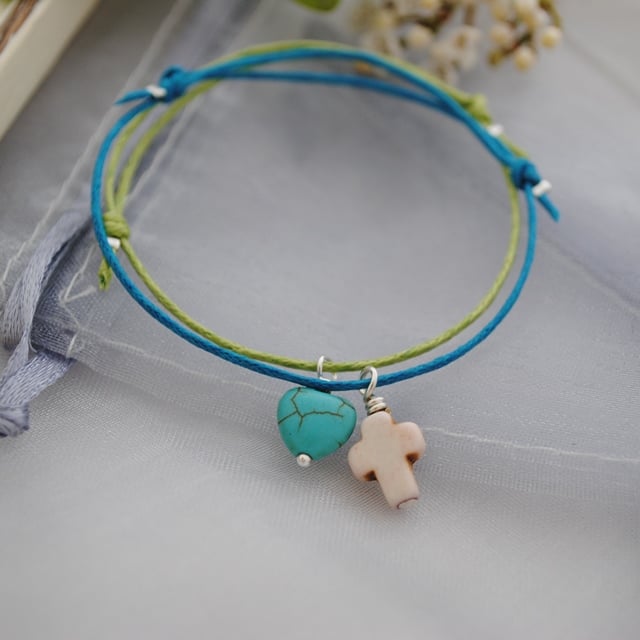 One bracelet is turquoise waxed cord with a bone / natural coloured cross and the other is made with apple green waxed cord with a green howlite heart.