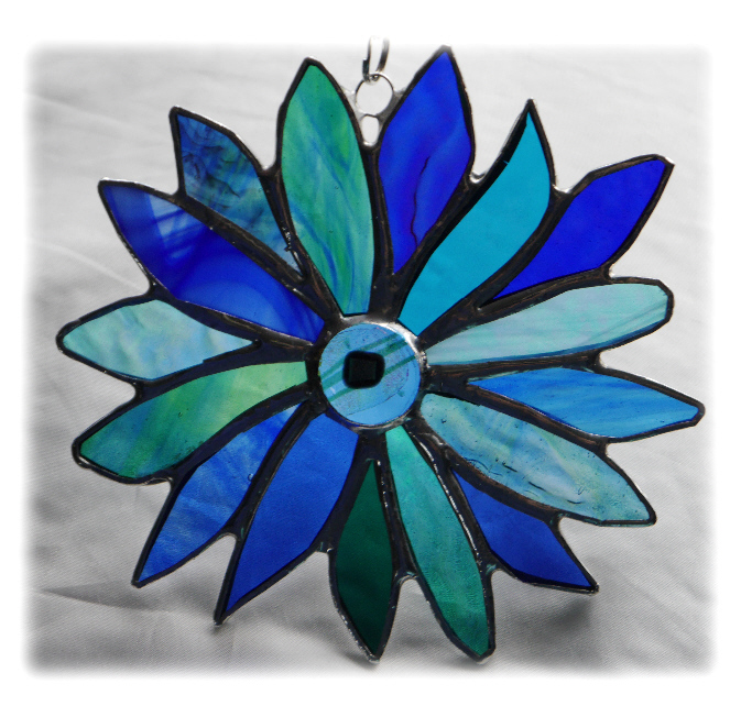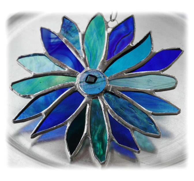 The flower has 16 petals, all slightly different shapes. In the centre is a bright blue glass nugget with pretty dichroic accents which I fused specially in my kiln.