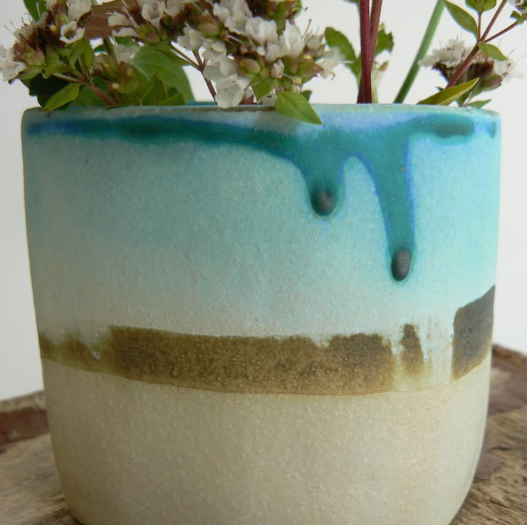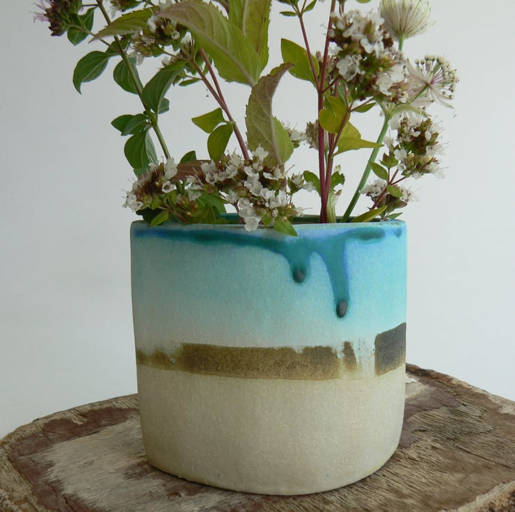 A small vase made from ceramic stoneware with a bright turquoise glaze and matt white glaze on the outside. Inside I have used a shiny white so that the vase can be cleaned easily.