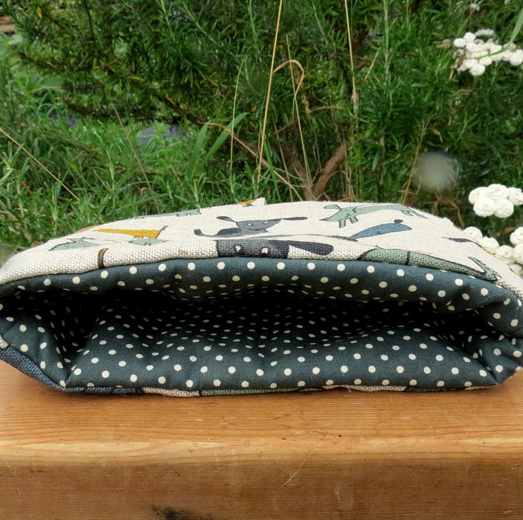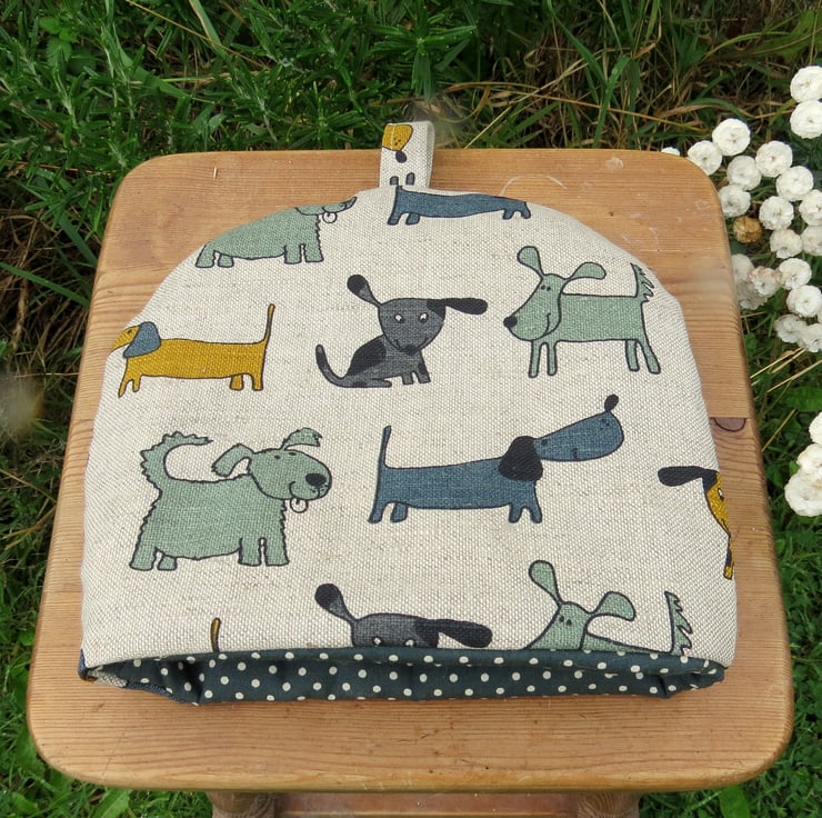 This little tea cosy is made from a cotton/linen fabric with a whimsical dog design.