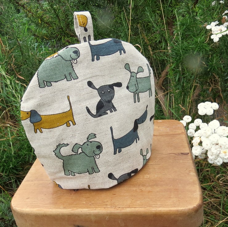This little tea cosy is made from a cotton/linen fabric with a whimsical dog design.