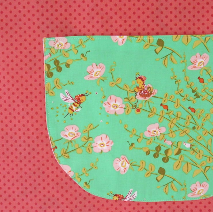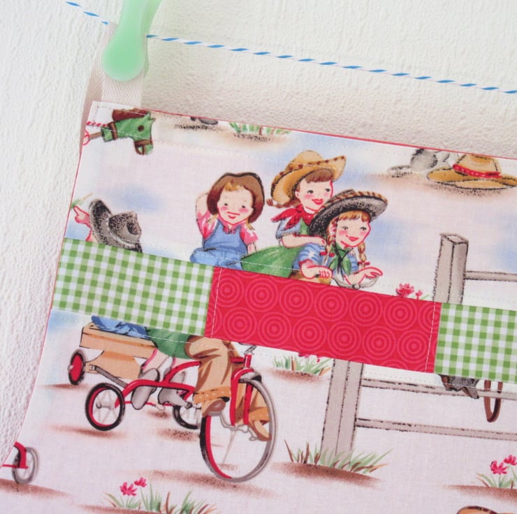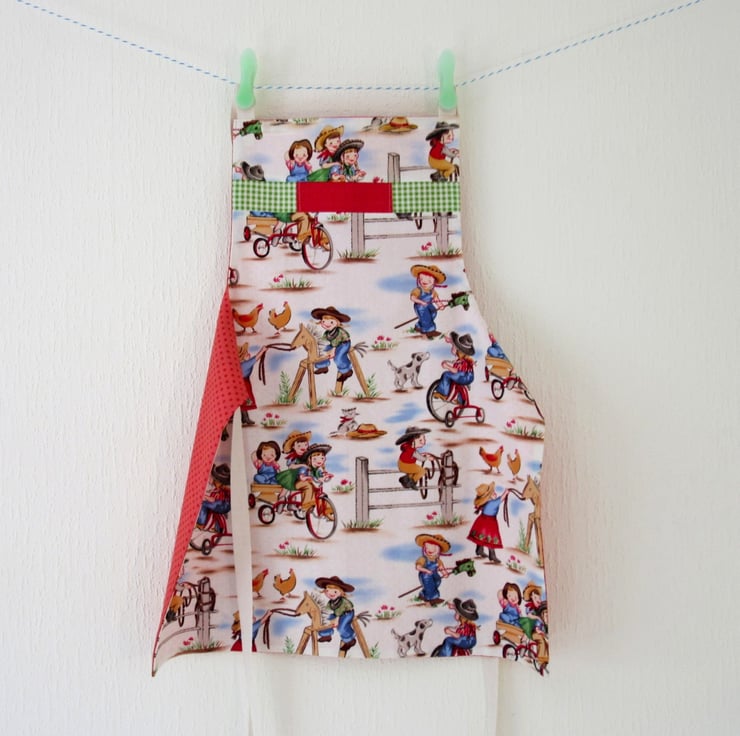 This little apron has two different looks - one side has cow-girls with pigtails in cute checked shirts, and the other side has a lovely green pocket with little bees and flowers on a polka dot background.