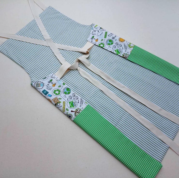 Please note that I am now making my aprons with a new cross tie fastening style - so your apron will have ties like the final photo. This ingenious method means the apron grows with your child, so you don't need to buy new ones as they get bigger. The cross-back tie style is more comfortable and safer than a neck loop. However, always supervise your child when wearing an item with long ties.