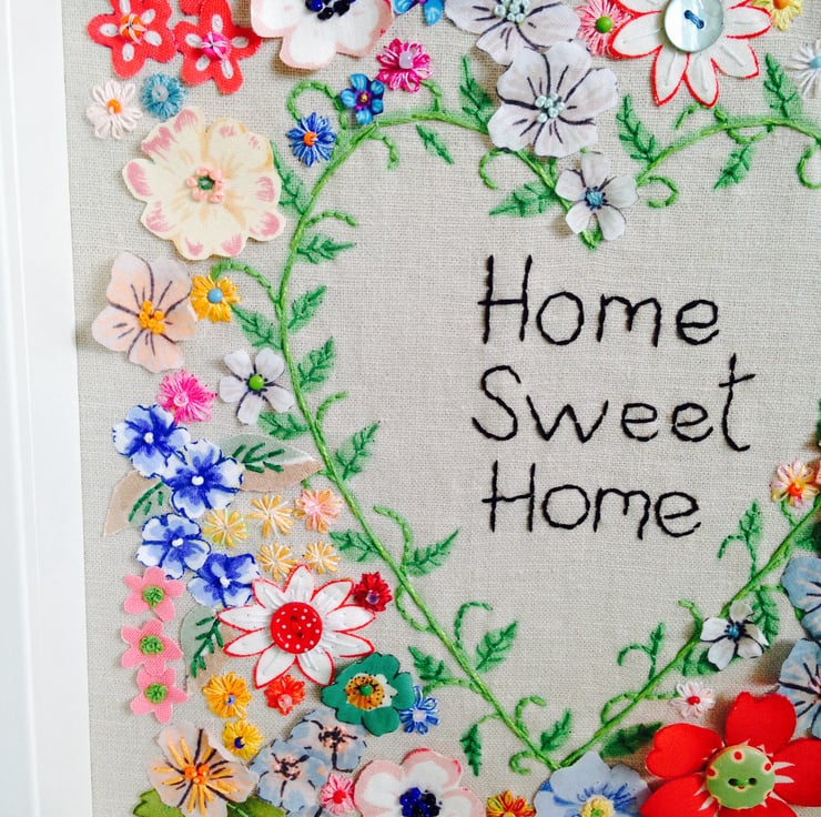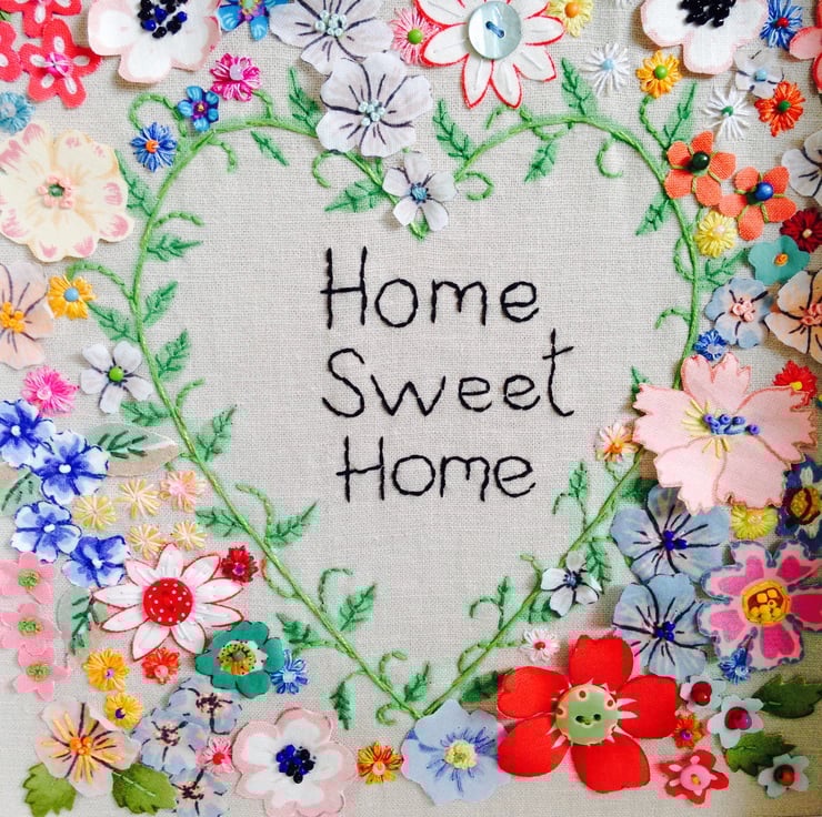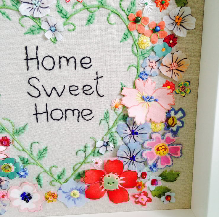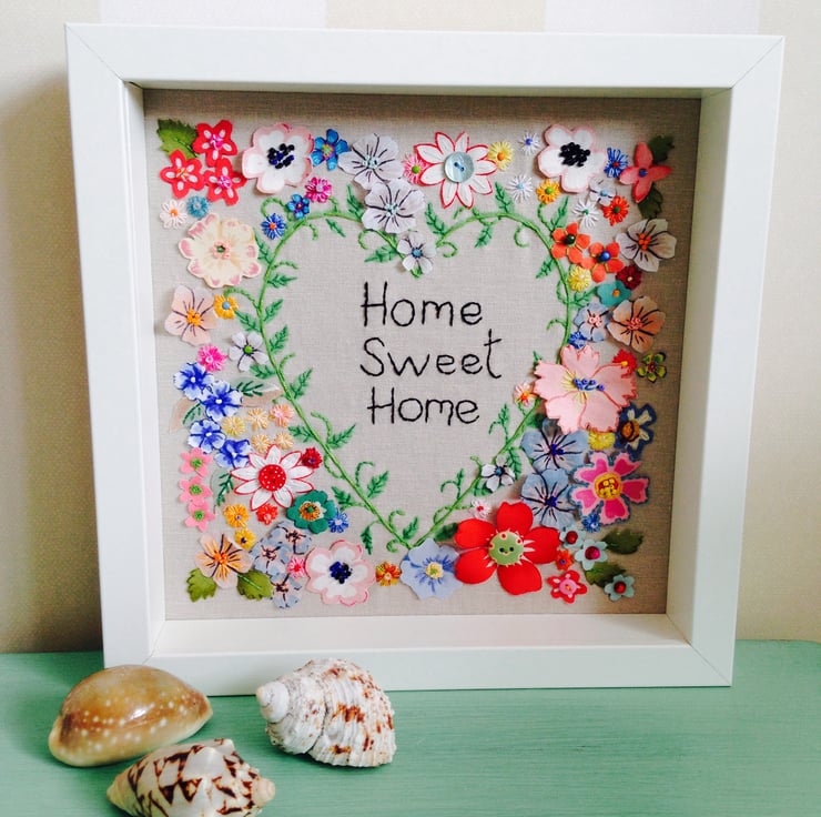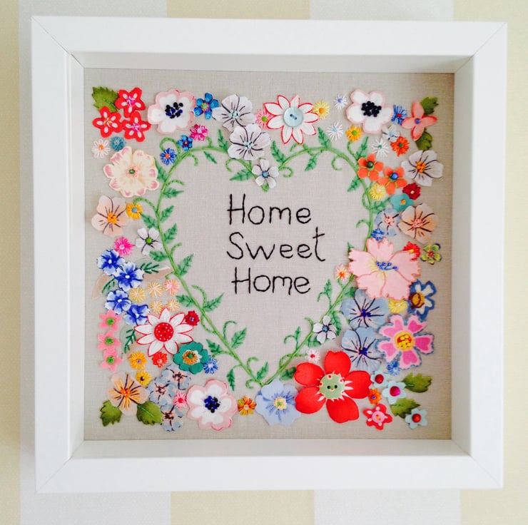 This cheerful picture is an original, designed by me.The flowers are cut from fabric and sewn on to the linen background using embroidery stitches, beads and the odd button.The heart shape has been painted using fabric paints and the leaves have been embellished with embroidery.The lettering has been added using back stitch.