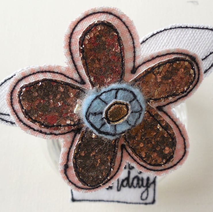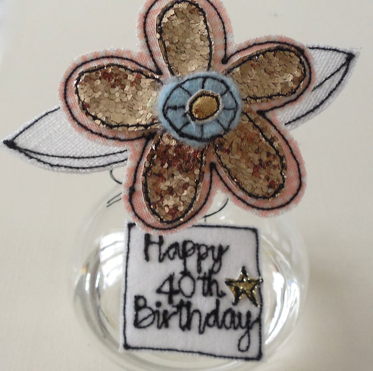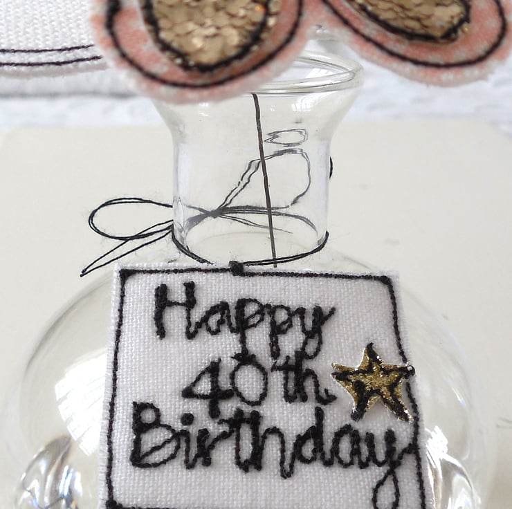 A fabric flower sits in a miniature glass bottle. The flower and leaves are created using sewn fabric and a wire stem holds them in position in acrylic water. The flower and bottle measure about 11cm and the flower about 4cm. Around the bottle neck hangs a sewn fabric label saying 'Happy 40th Birthday'. Please note: for decorative purposes only.