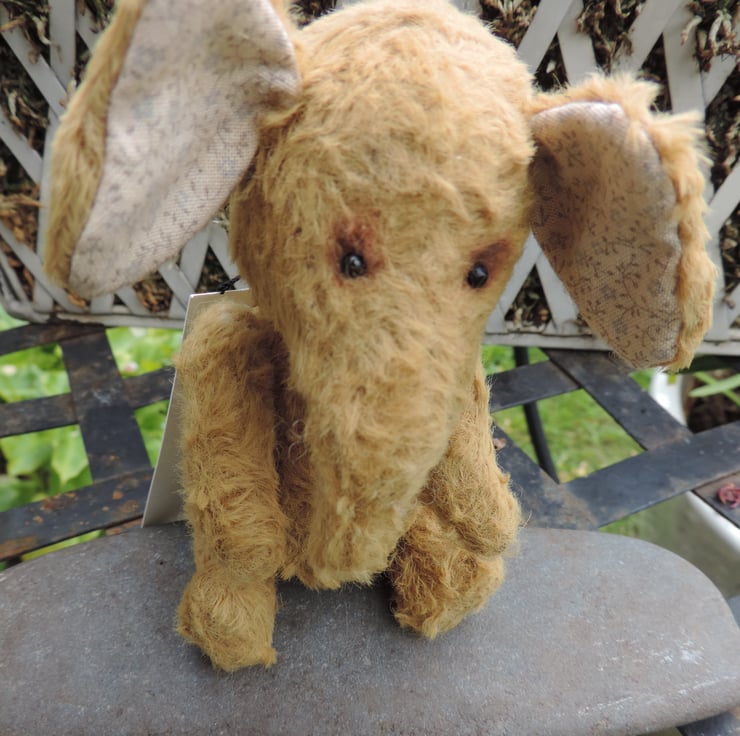 Sweet little vintage style elephant.Slightly distressed, in an old gold viscose with cotton fabric ear lining. Fully jointed with glass eyes. Hand sewn with love. This is not a toy! Collectors item only! )This elephant was designed by Olga Orel. Made by One of Sam's.