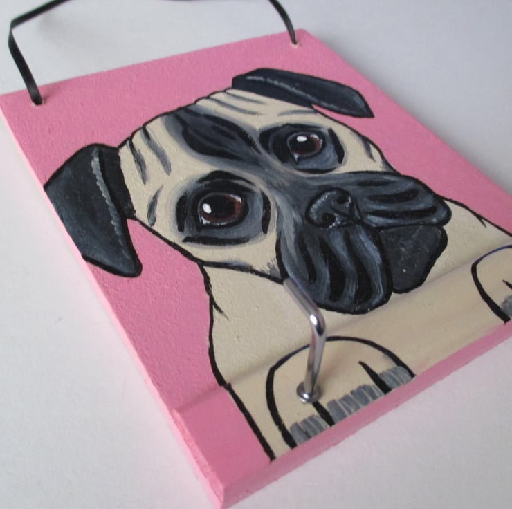 This is a lead holder, featuring a hand painted pug dog on a background of pink. It has 2 hooks, and is painted in acrylics on MDF, which has been varnished for protection.