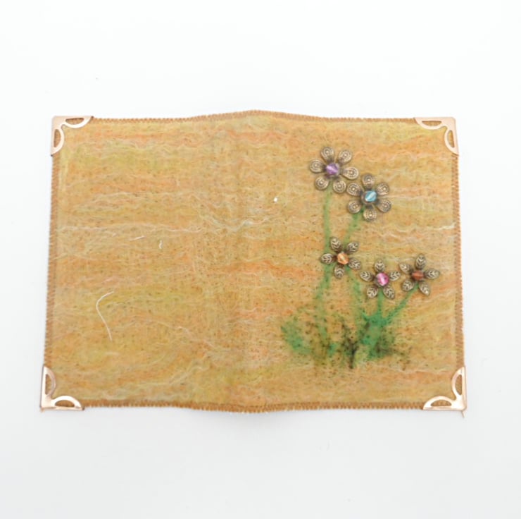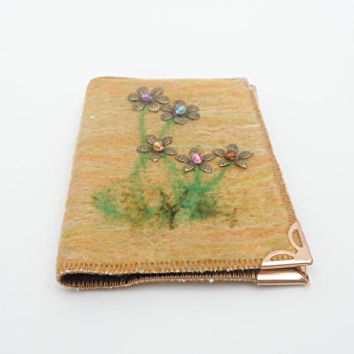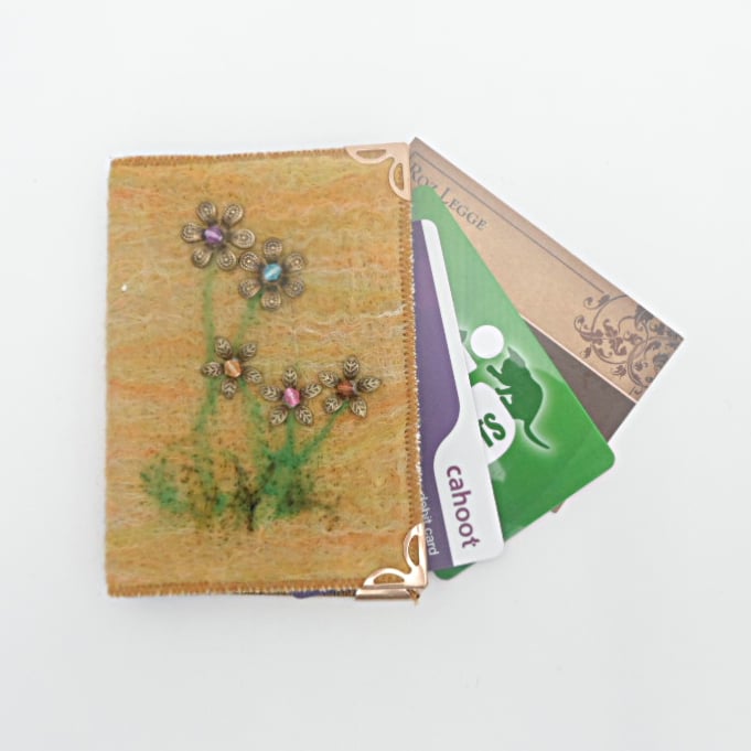 This card wallet is just right for holding all your business cards or credit cards (or both!). A black vinyl inner has been covered with an orange/yellow/green blend of hand made felt onto which a floral beaded design has been stitched.