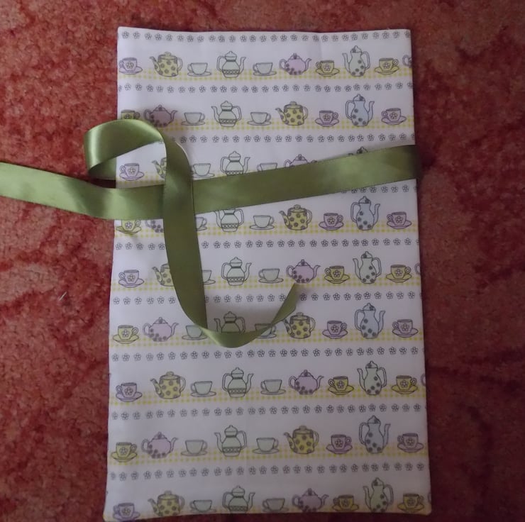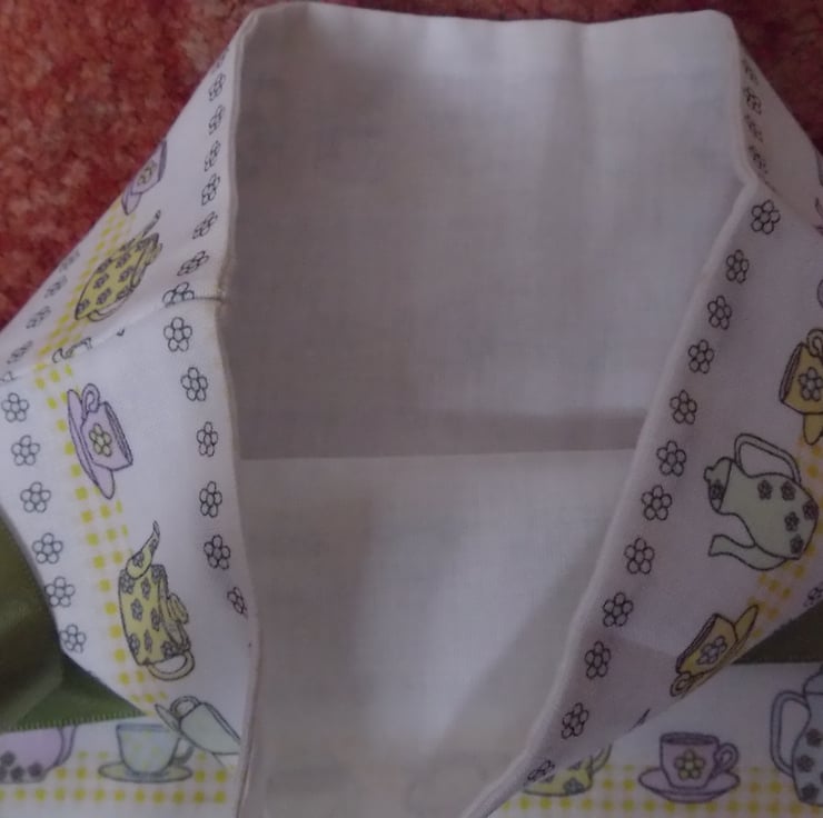 The bag is approx. 32cm x 20cm (12.5 inches x 8 inches) and is lined with a white poly cotton fabric. The tie is in a co-ordinating green ribbon.