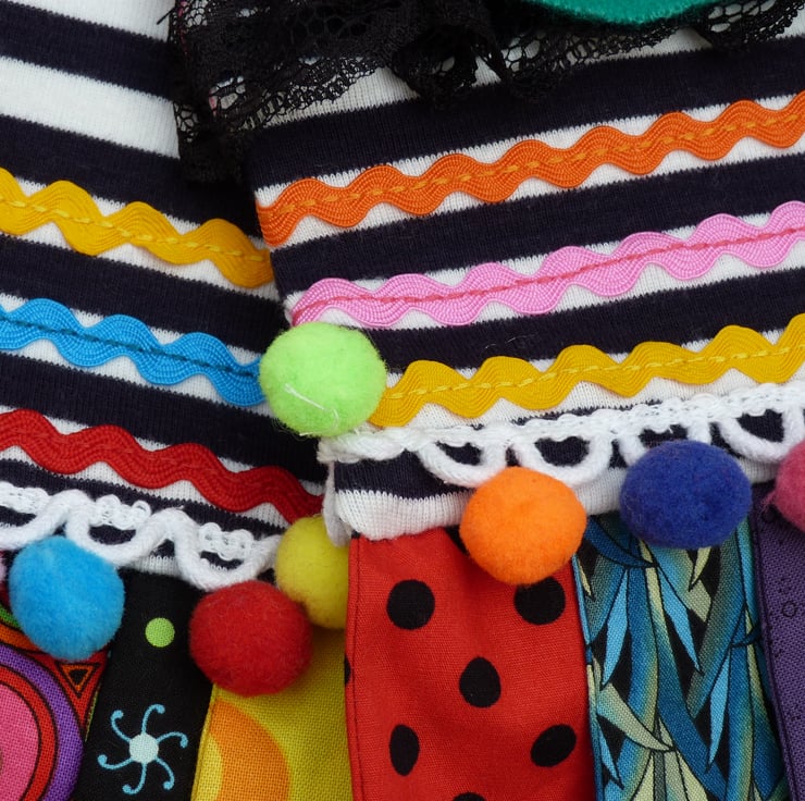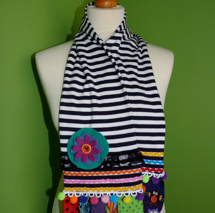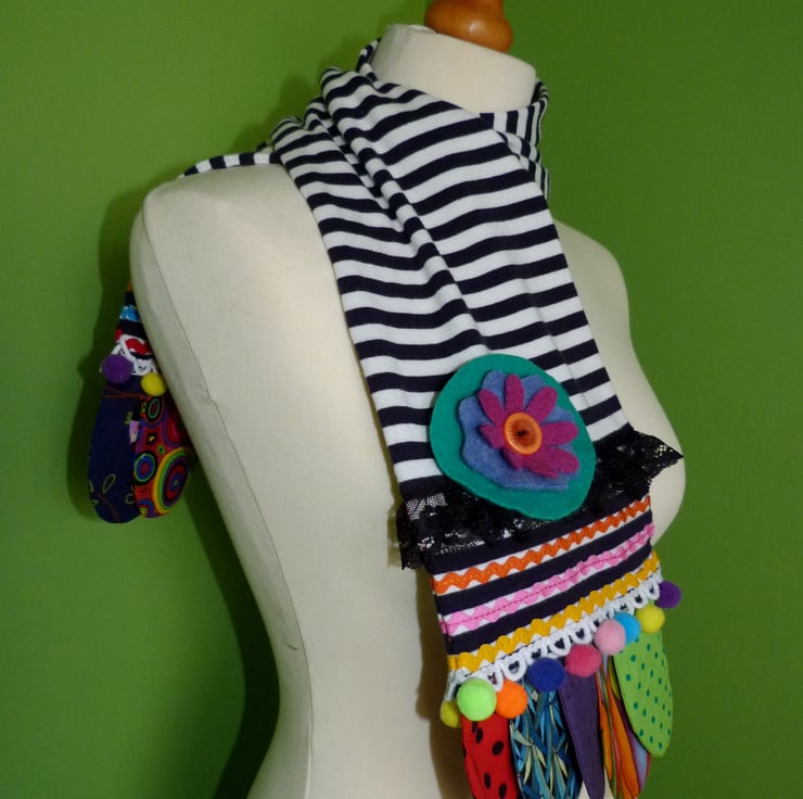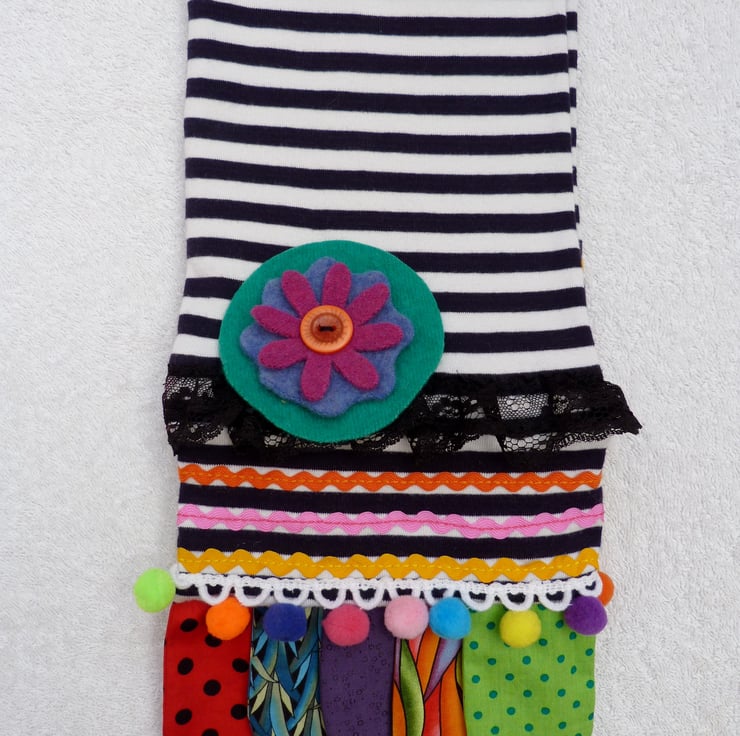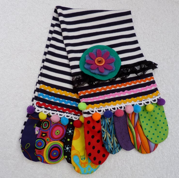 I have created this fun and funky scarf from an up-cycled quality cotton jersey t-shirt. The scarf has decorative multicoloured cotton tabs at each end, along with ric-rac, lace and pom-pom trim. I have made a felt flower, which has been created from up-cycled wool sweaters, and sewn to the scarf.