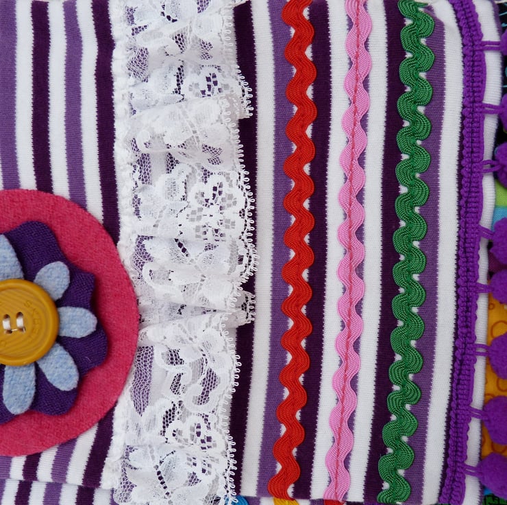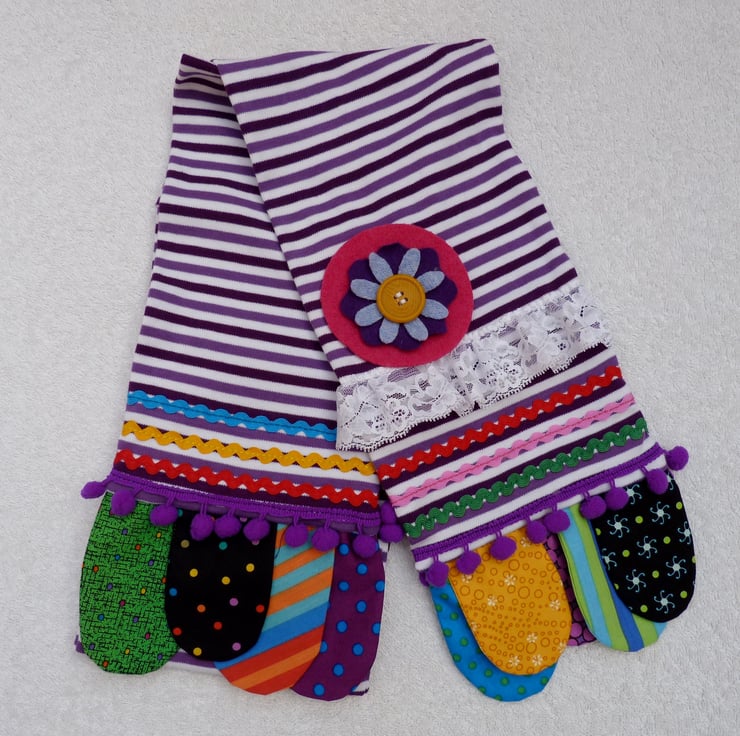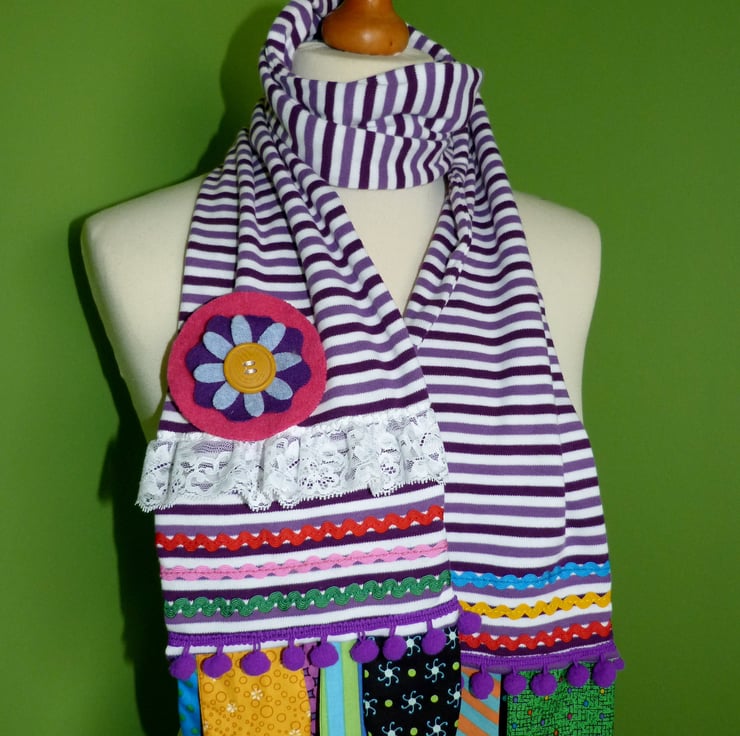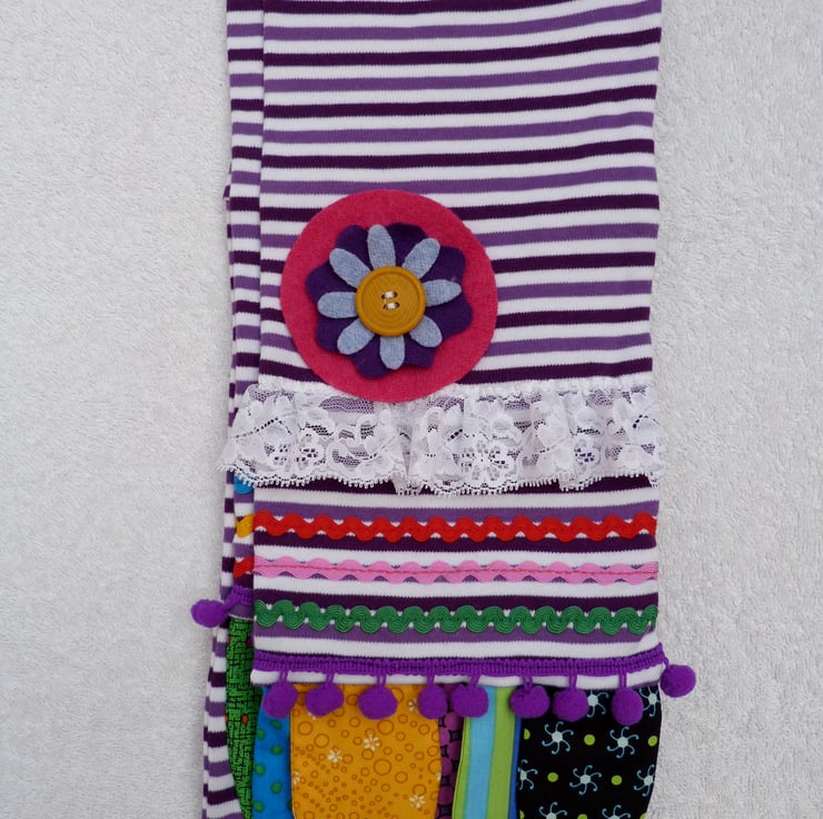 I have created this fun and funky scarf from an up-cycled quality cotton jersey t-shirt. The scarf has decorative multicoloured cotton tabs at each end, along with ric-rac, lace and pom-pom trim. I have made a felt flower, which has been created from up-cycled wool sweaters, and sewn to the scarf.