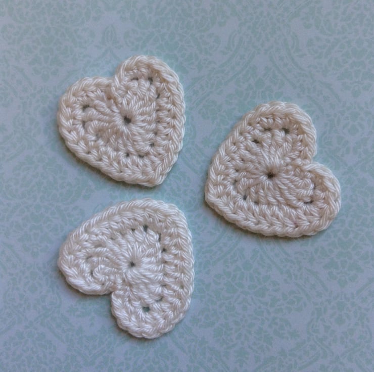 Pack of 3 medium sized heart appliqués embellishments crocheted in cream 100% cotton yarn.