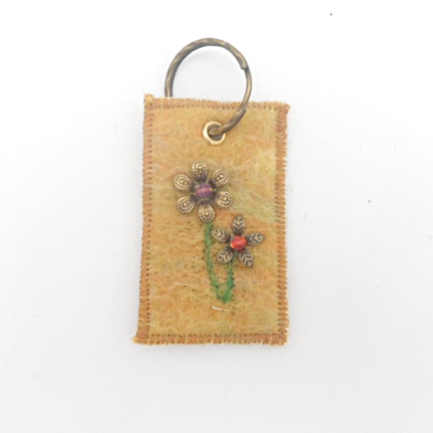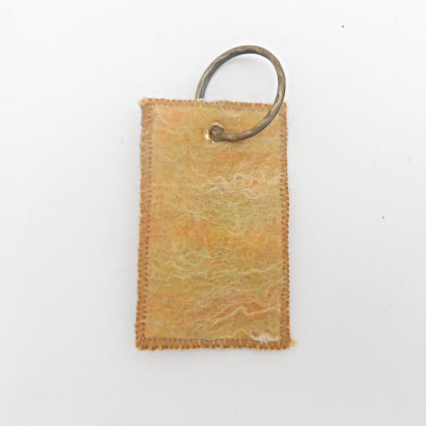 This key fob has been made from handmade felt using merino wool in a blend of orange, yellow and pale green colours. It measures approximately 4cm x 7cm and has a 25mm split ring key ring attached for your keys.