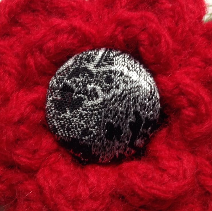 It has three layers of petals in red with two leaves and finished with in the middle with a black and silvery grey fabric button.