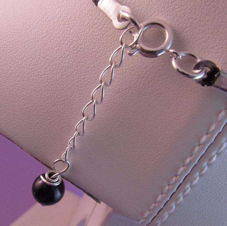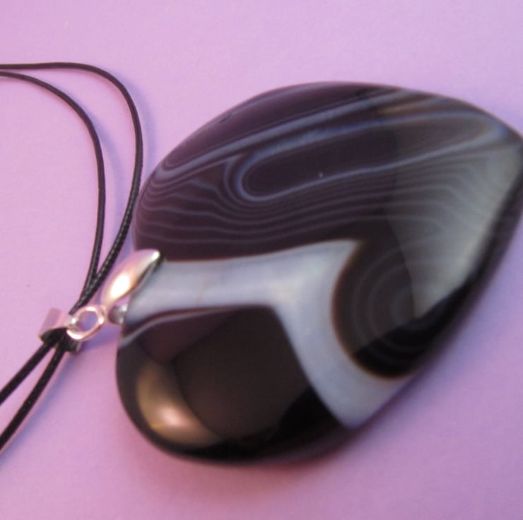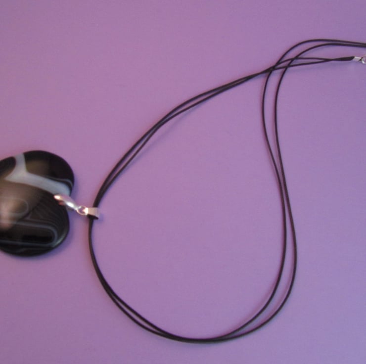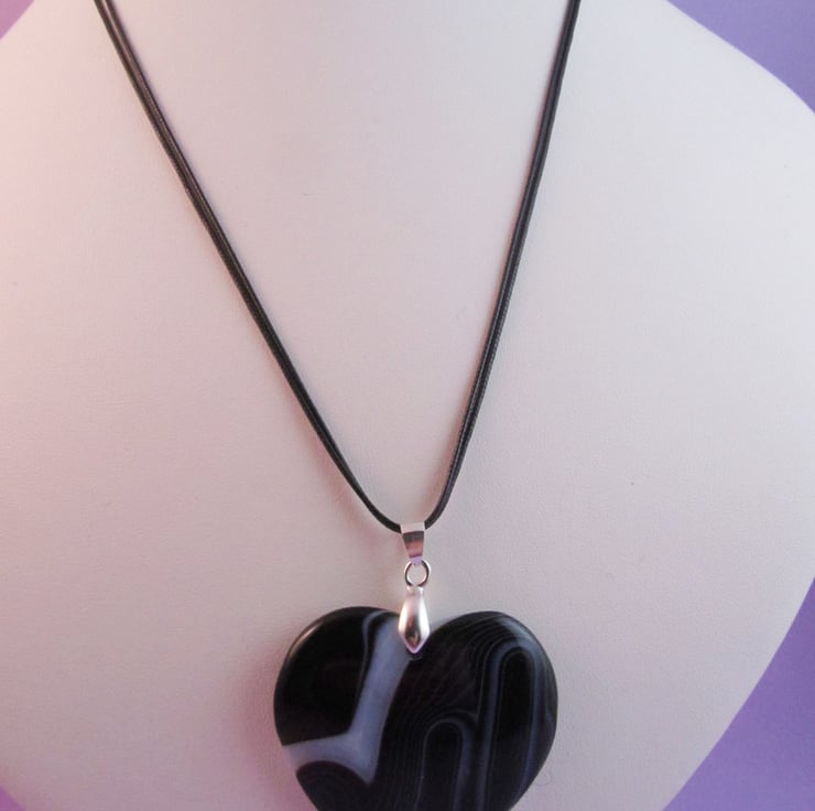 This is a beautiful black heart agate pendant necklace. It is created with a real black heart agate gemstone, silver plated brass, silver plated copper, black waxed cord and a real black agate gemstone on the extender. It is a stunning piece and would go with most outfits.