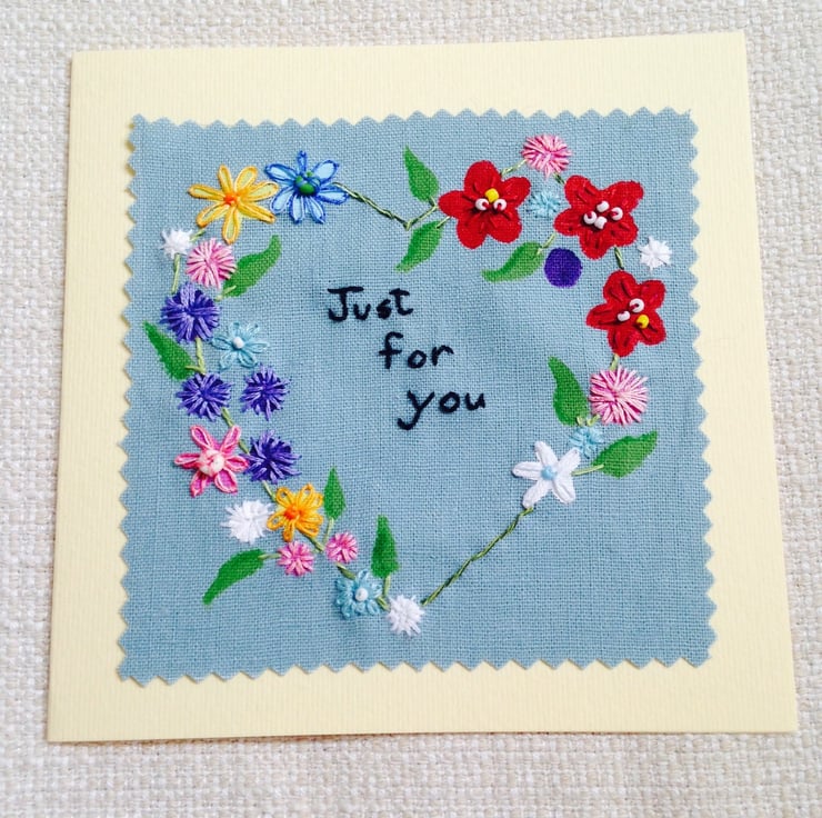I have hand painted and embroidered this card, the flowers have been embellished with seed beads . It measures 13cm by 13cm and is blank inside. It comes with a white envelope and a protective cellophane bag.