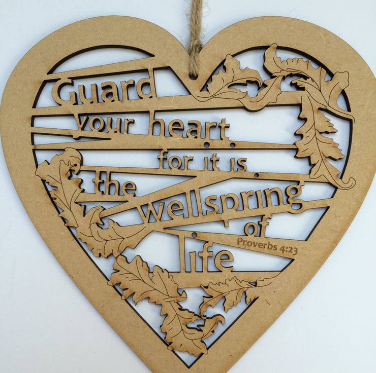 A delicate wooden heart laser cut and etched with the text from Proverbs 4:23