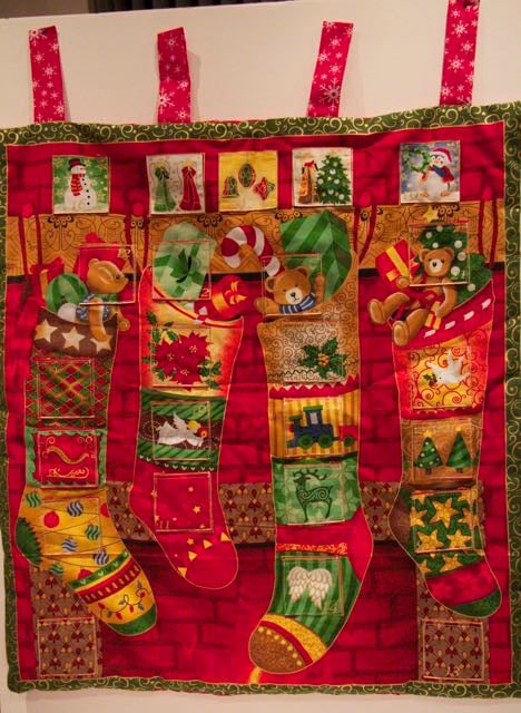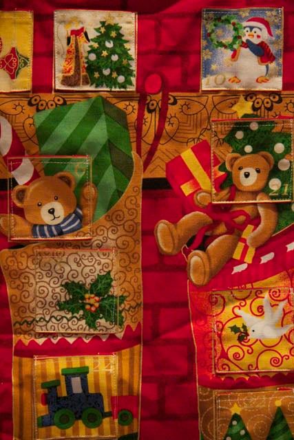 A fabric advent calendar with individual pockets for each day of advent. This is great for using again and again and can be filled with anything you like. The calendar depicts stockings hanging from the fireplace.