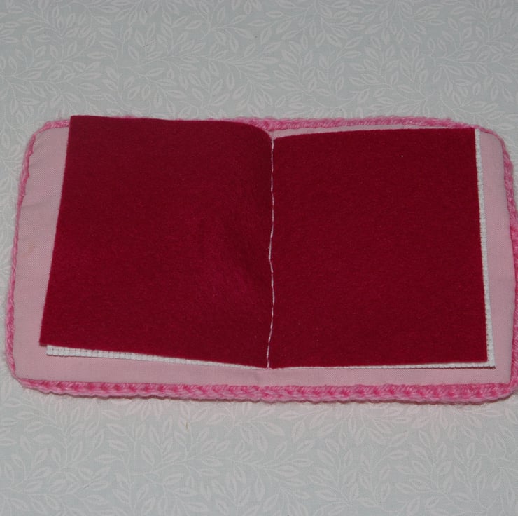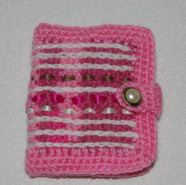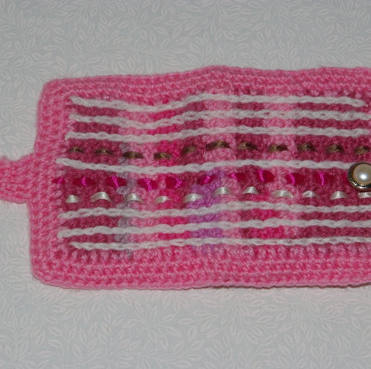 This sweet little sewing needle case has been created in crochet in varies shades of pink and white acrylic yarn. The different pink shades change throughout the case with a single tone of light pink border around the edge. The case has been over crocheted in white chain stitch and has three individual strands of satin ribbon woven through the crochet.