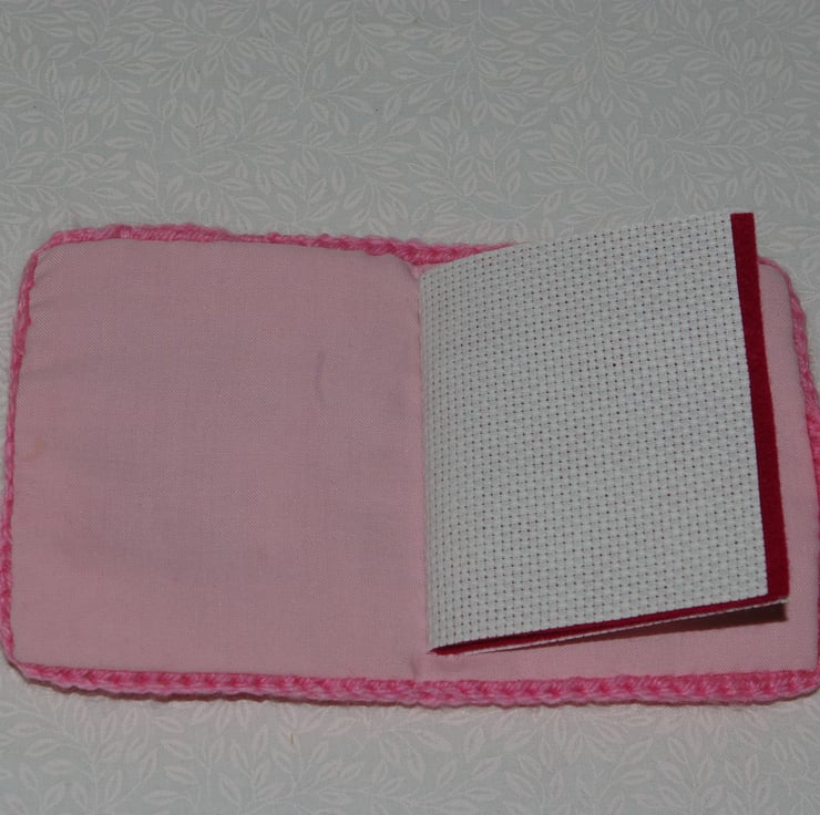The sewing needle case is lined in a plain pink polyester-cotton fabric, and has four pages or leaves sewn into it white embroidery thread. Two of the pages are created in a maroon felt for normal sewing needles while the other two pages are created in white cotton cross stitching aida which will hold the fatter darning, tapestry and cross stitching needles.