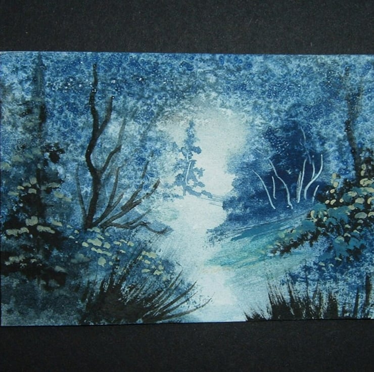 A tiny woodland watercolour painting that has been created using quality materials. It will come in a clear polybag to protect it. This is an original and not a print. An aceo is a miniature painting that measures just 2.5" x 3.5" and is highly collectable. It can be framed or displayed in a photo album.